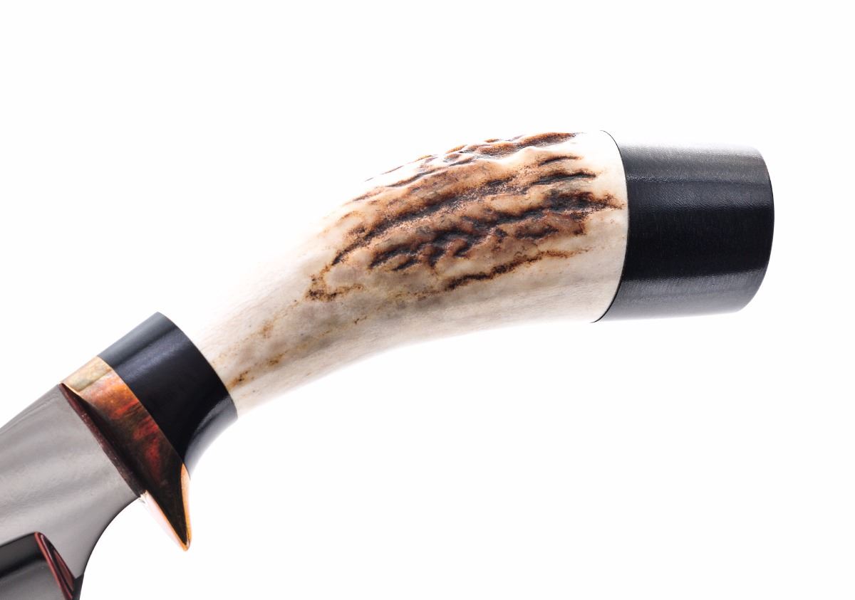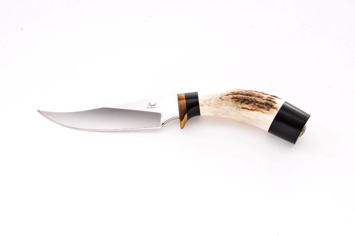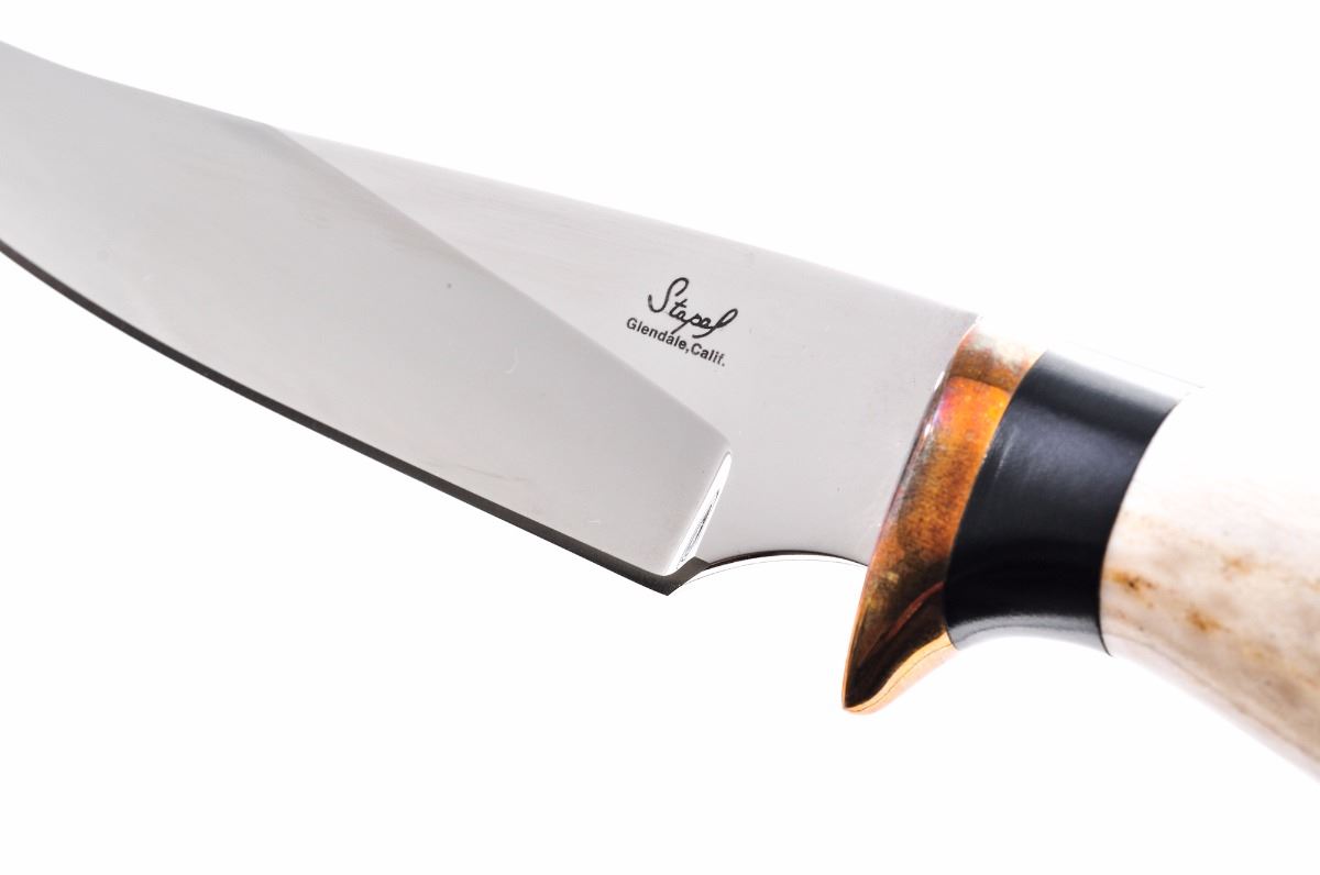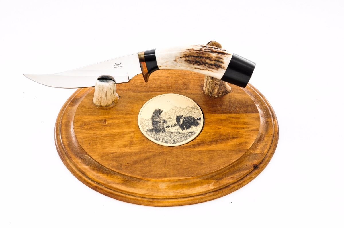 Custom Fixed Blade Knife, by Chuck Stapel, 5-5/8'' trailing point blade, 11'' overall, blade marked ''Stapel / Glendale, Calif.''; brass guard, stag handle with large Micarta spacers held in place by a brass cap. Includes an oak base with antler knife rest and decorative scrimshawed faux ivory medallion of two bears in center. Condition is excellent, appearing as new, showing no signs of use. Blade with fine micro-scratching; brass guard with moderate even toning. Est.: $125-$250.
