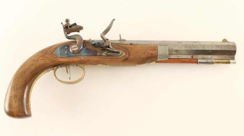 9.5" octagonal bbl marked C.D. Fincher, bass furniture, case hardened lock, hammer & flash pan, wood ram rod & one-piece wood stock. Lock is marked "MM/MASLAM/WARRANTED", the hammer shows some old pitting and the barrel displays some scattered light rust. Action is sound, bore is pristine and wood stock is very good. Condition is good. ***Antique Firearm***