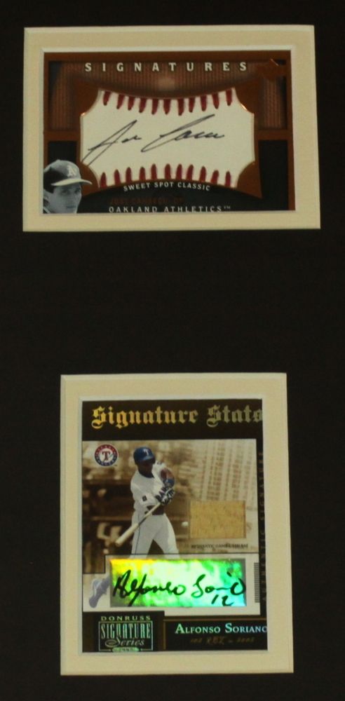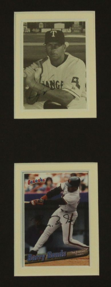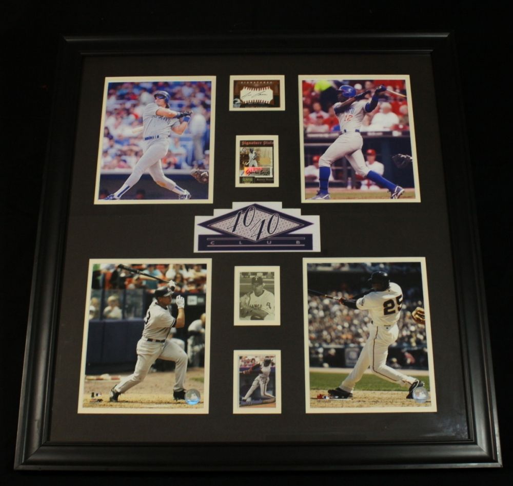 This custom framed piece measures 29" x 31" in size and featues all four members of the exclusive 40 Home Runs / 40 Stolen Base club (Barry Bonds, Alex Rodriguez, Alfonso Soriano and Jose Canseco). Piece includes pack insert Autographed cards from all 4 players as well as unsigned 8x10 photos of each. Please see photos for details on the cards that have been framed.