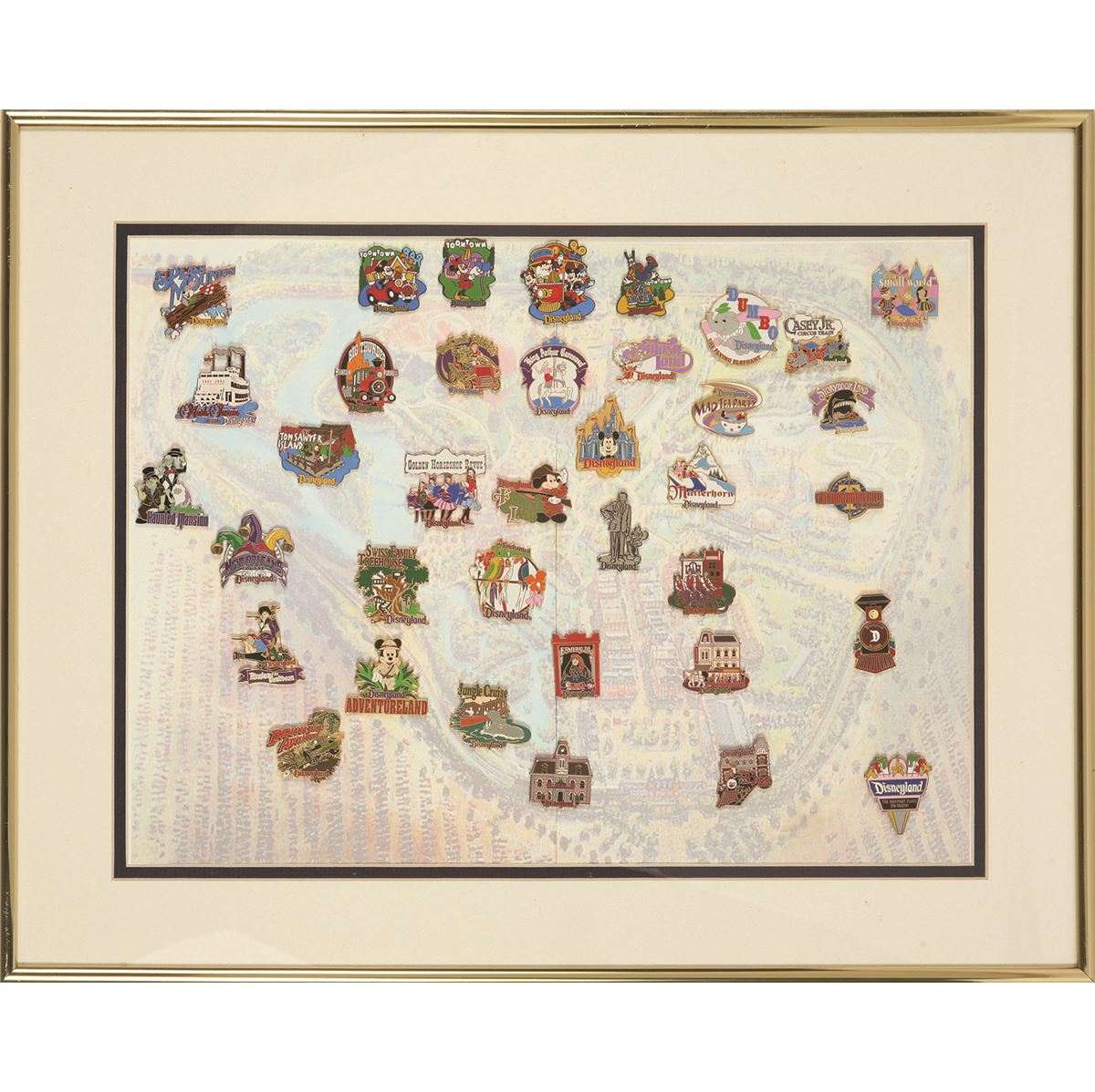 (Disneyland, 1998) Beautifully framed full set of 37 Disneyland attraction pins framed over custom map background, In fine Condition. Overall framed size: 16" x 20"