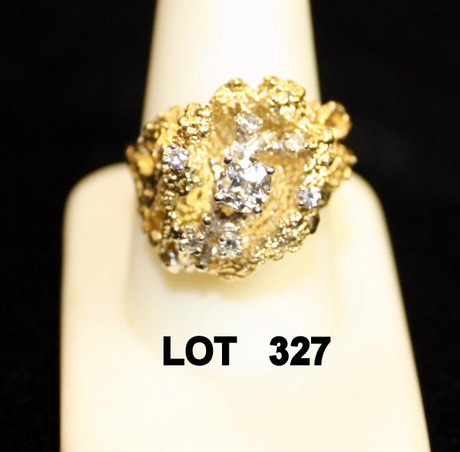 Custom Gold Nugget design ladies ring, set with approx. 1/2ct diamond center, surrounded by 6 diamonds of approx. 1/2ct, for a total of approx. 1ct. Mounted in 14kt. Est: $700 - $1,400