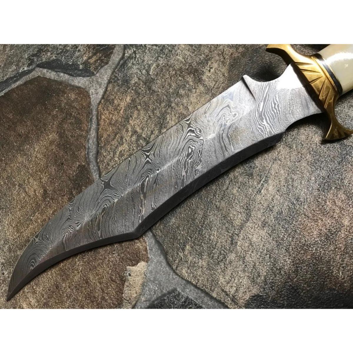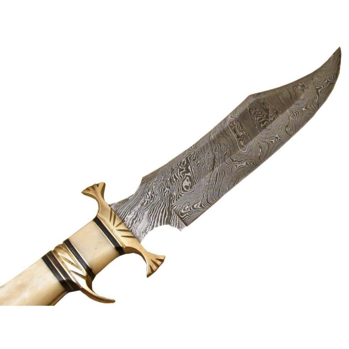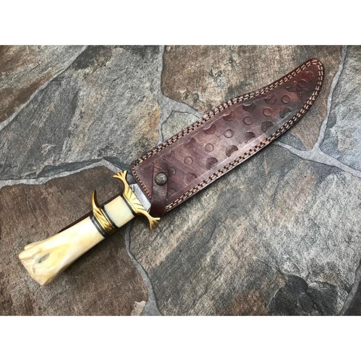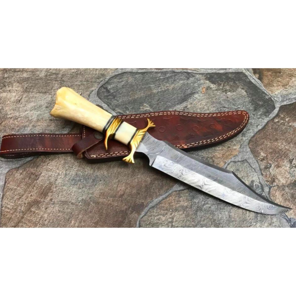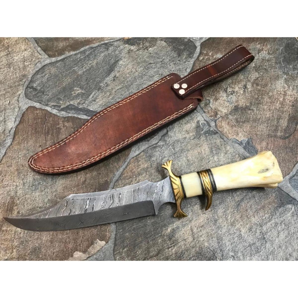 Custom hand-forged Damascus steel Bowie hunting knife, with fine symmetrical hand grind features, excellent heat treatment to 9 1/2" blade, with 5 1/2" length camel bone & brass handle. 15" overall length. - 9364-022318-EB-07602