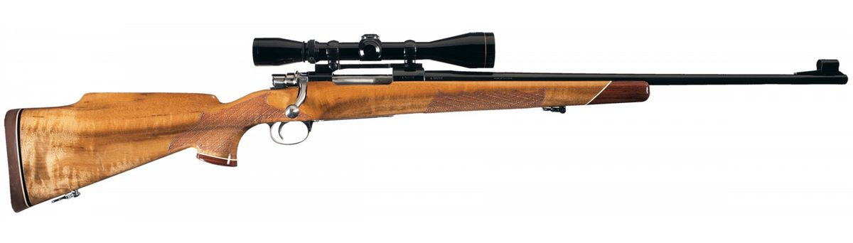 Hooded blade front sight with no rear sight installed. Mounted with a Leupold 3 X 9 Vari X II on a redfield base. Fabrique National (FN) manufactured supreme action and barrel. Fitted with a deluxe blond myrtel stock with contrasting rosewood tip and pistol grip cap. Crisp straight and scalloped border French style (skip line) checkering with an Imperial" White Line" solid rubber recoil pad. This rifle was marketed by Herters Sporting Goods between 1965 and 1970.