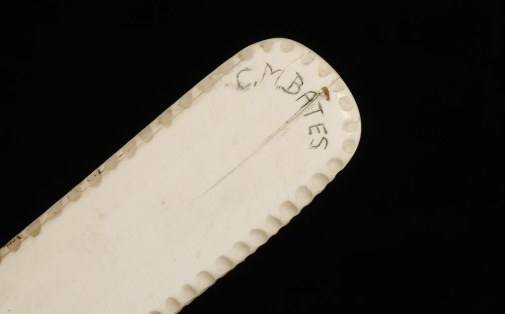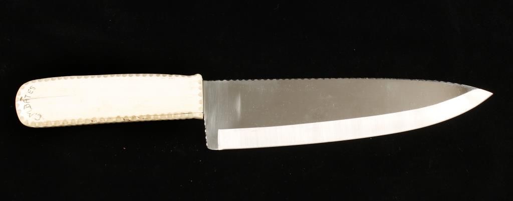 Ivory handled knife with a kitchen type blade that has a "wavy" spine. The protective cover over the blade is labeled " Ivory Handle Custom Knife 300.00"