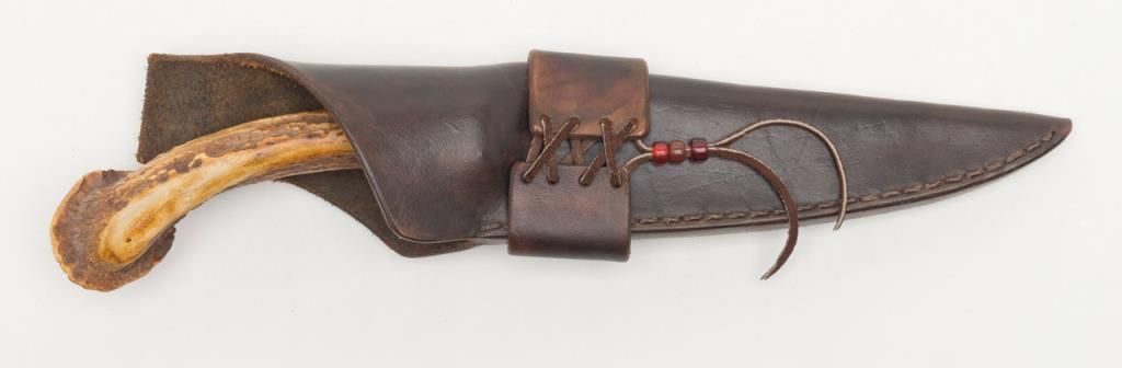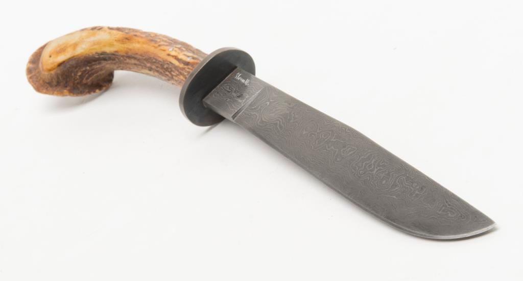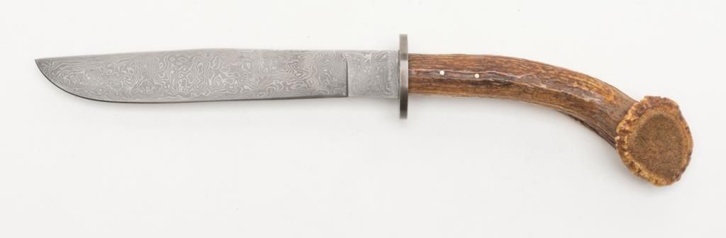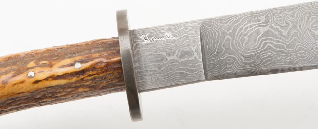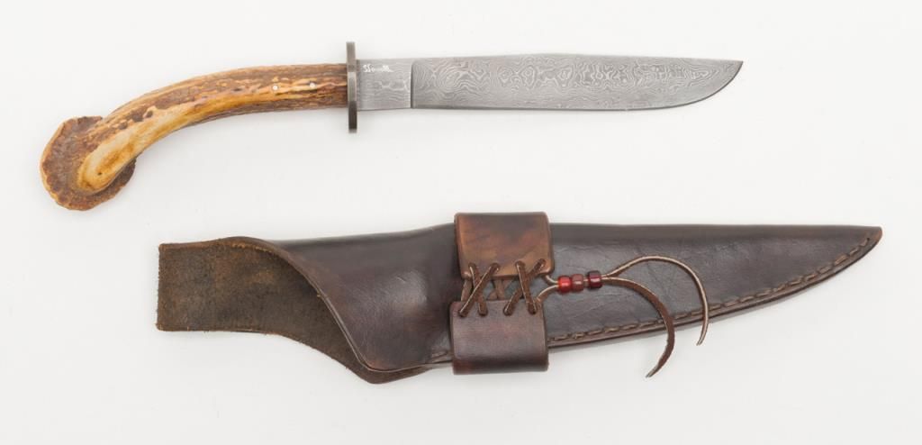 Custom Knife by Howell. A handcrafted custom knife with a 7 5/8” Damascus style blade and overall length of 14”. The blade features an intricate finish while the scales are completed in pinned, one piece stag. The stag has taken on arich gold color with age. A nicely done custom knife marked “Howell” in front of the pommel. The knife includes a custom, unmarked leather sheath. Est.: $175-$350.