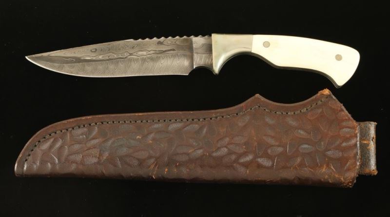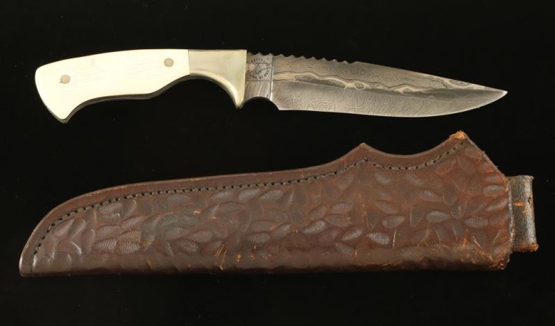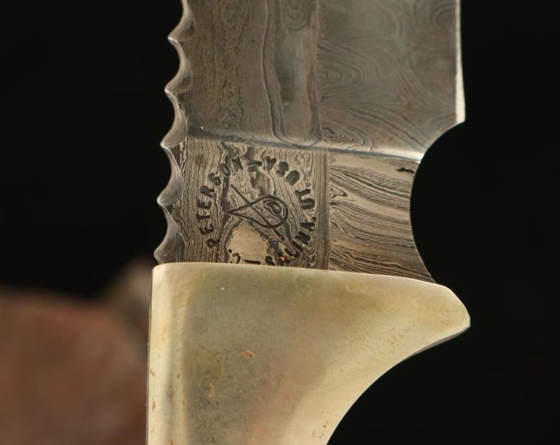 by C. Peterson marked made in Utah. Damascus blade 5 1/2" blade 10" overall with bone handle includes leather sheath.