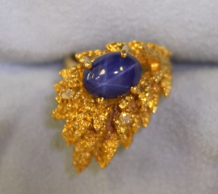 In 14k yellow gold. Contains an oval 9x7mm star sapphire with very visible and crisp "star". Also contains two high quality .015ct diamonds. Size 2 3/4. 11.1g.
