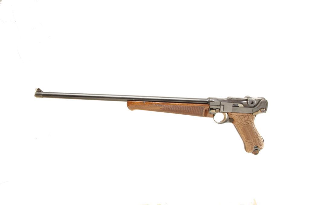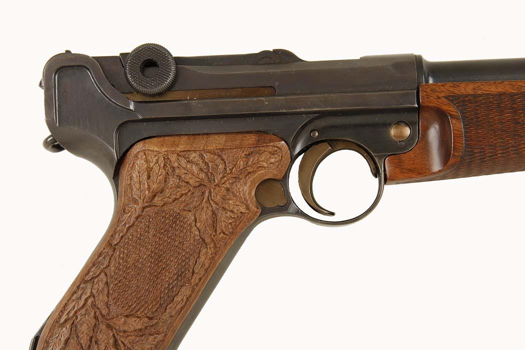 condition: Exce1920's style custom Luger Carbine, possibly by Martz. Blued finish, beautifully carved and checkered stocks with oak leaves, 16" barrel with fixed sights, gold wash controls, good bore and action.condition: Excellent as restored. Stud for should stock but no stock included.