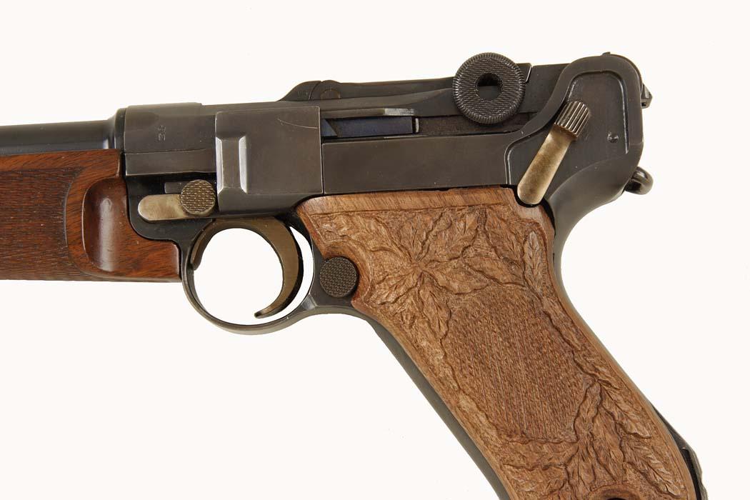 Custom Luger Carbine Cal 9mm SN:1879 1920's style custom Luger Carbine, possibly by Martz. Blued finish, beautifully carved and checkered stocks with oak leaves, 16" barrel with fixed sights, gold wash controls, good bore and action.