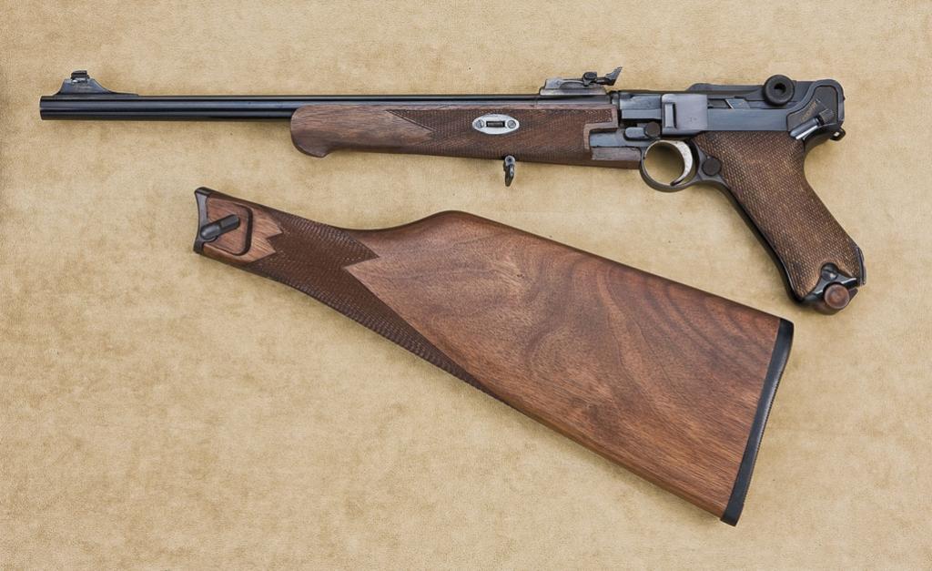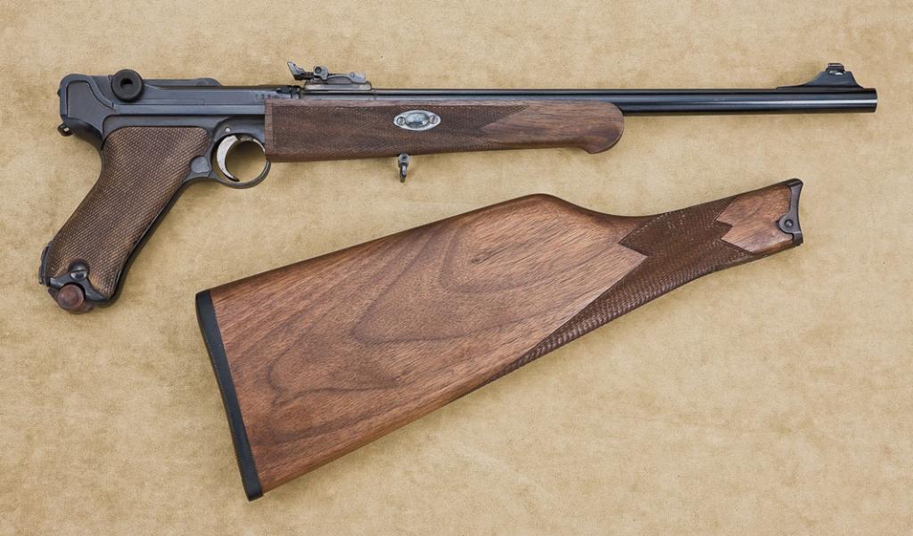 Custom Luger Carbine, Mantz type, with detachable checkered wood stock, 9mm cal., 14” round barrel,