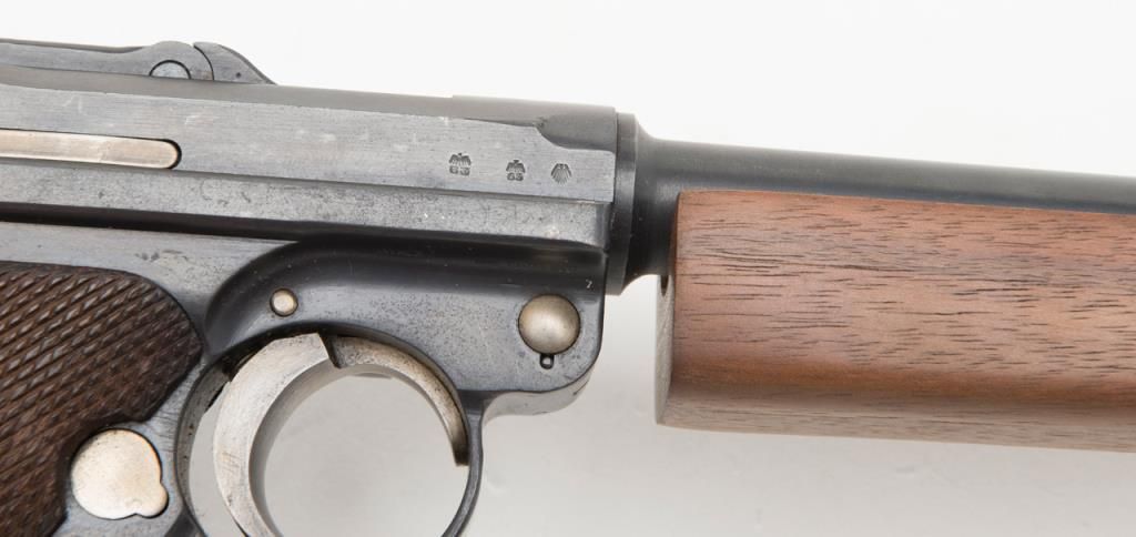 Custom Luger Carbine with 16” barrel, 1936 S-42 made by Mauser, new replacement barrel and forearm; 9mm cal., shoulder stock, custom leather display case. (C&R/PPT). Est.: $1,250-$2,500.
