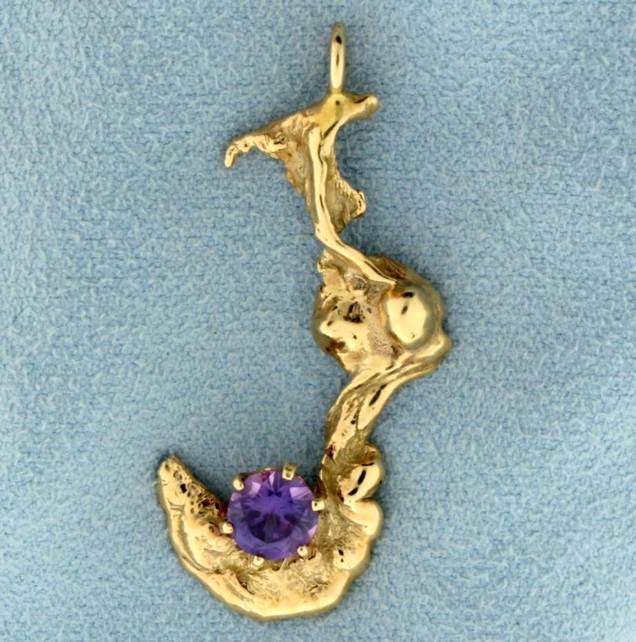 In 14k yellow gold, containing 3/4ct purple sapphire with excellent deep purple color. 1 5/8 inches long. 4.g.