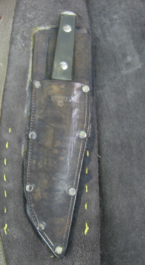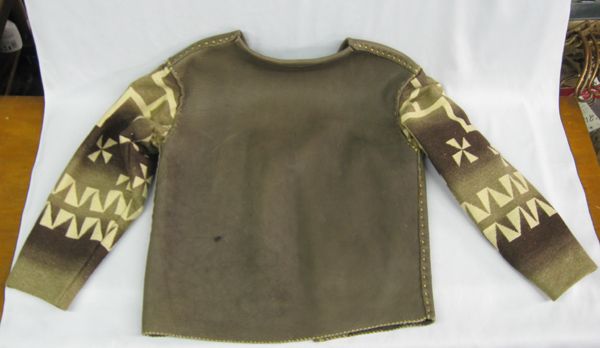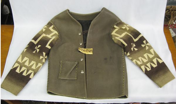 Dynamic Custom Made Buffalo Hide & Pendleton Mans Coat, size M/L, trimmed in sinew and reptile skin clasp closure, rugged hunting coat, has small bullet hole in buffalo hide on backside of coat, custom made by Knife Maker Earl K. Mann, Tru-Bal Leather Scabbard mounted inside of coat with Tru-Bal Throwing Knife, 1 pocket, embellished with 4 Indian Head Nickel Buttons, Pendleton Sleeves, Truly a Unique Piece