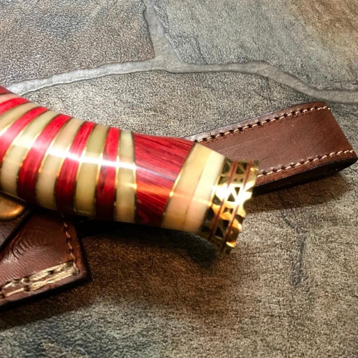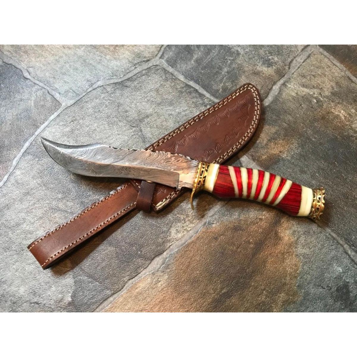 Unique custom hand-forged Damascus Steel Hunting Bowie Knife with camel bone, colored wood & brass spacers. The blade crafted with 216 layers of 1095 & 15N20 high carbon tool steels, with nickle layer & given excellent heat treatment to get a 56 to 57 HRC. Blade has razor-sharp edge. Comes with leather sheath. Overall length of 12". Blade -7" Handle - 5". * some bleeding on the handle from the wood stain into the camel bone, as pictured.