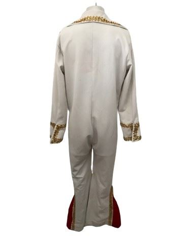 Custom made Elvis jumpsuit made by a vintage costume shop. Used in several productions over the past 40 years. White jumpsuit with gold sequence trim around the cuffs, collar, center and down the legs around the pant cuffs, with red inserts around the sides of the legs. A perfectly replicated Elvis look! Some stains on the front and back right leg.