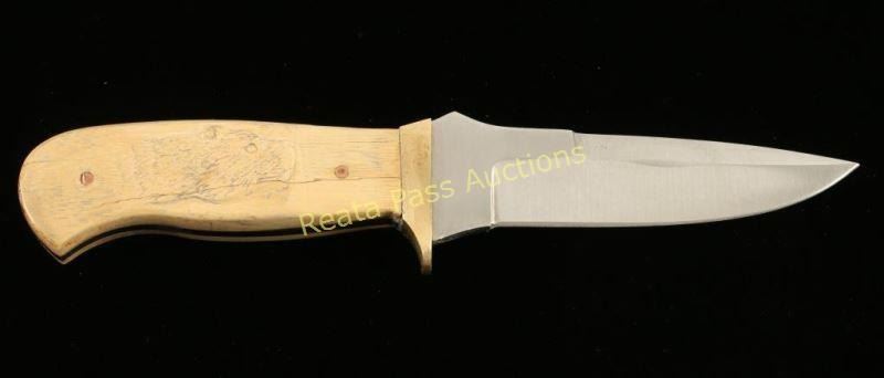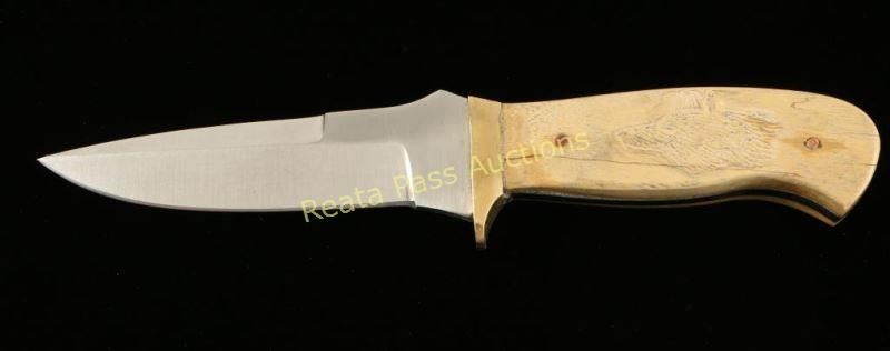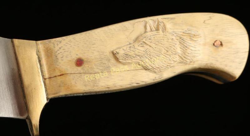 Carved spalted birch handle that depicts a wolf on one side and a bear on the other with a 440 stainless steel blade and brass guard. Measures 7 1/2" overall with a 3 3/4" blade. Made by Richard Green for Alaska Creations. A truly unique knife.