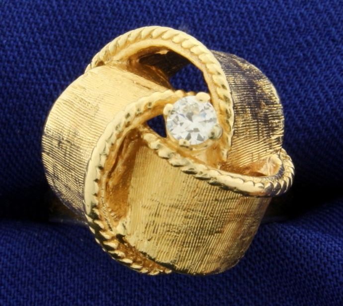In 14k yellow gold. Contains a high quality .2ct diamond, VS clarity/F color.. Size 7 1/4. 9.9g.