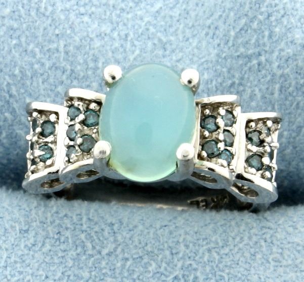 In 14K white gold there is a 9x7 oval moonstone and twenty .01ct blue diamonds. Size 5 4.7g