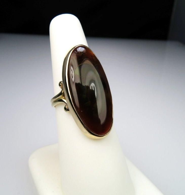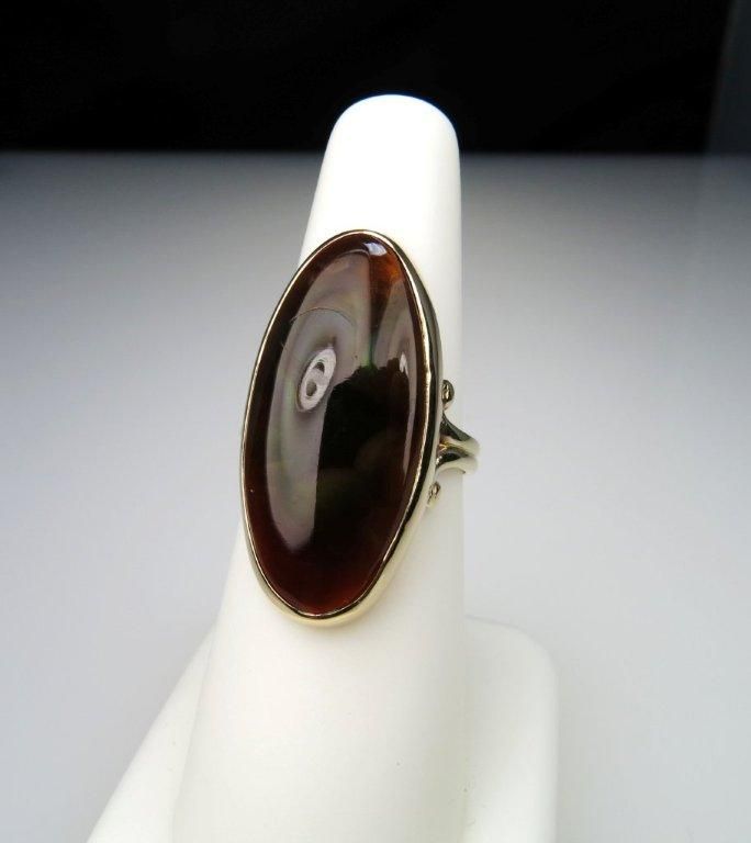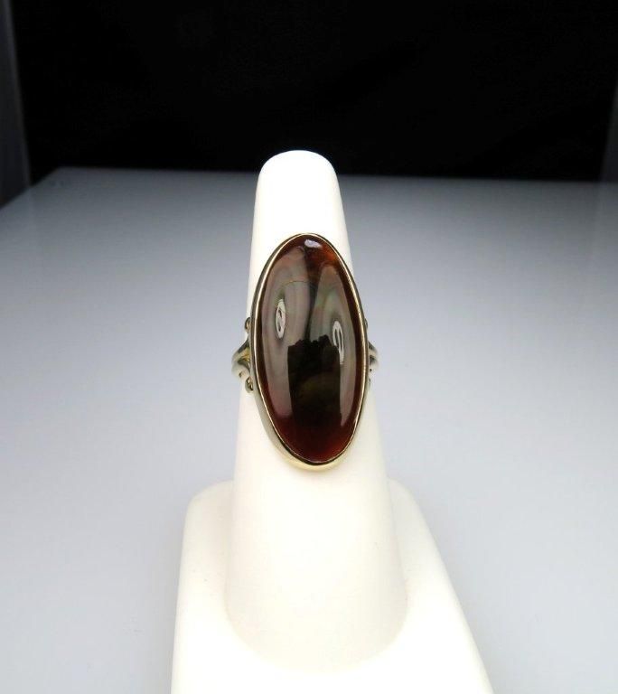 Fire Agate weight approx. 15.00 carats measures 25.00 x 12.00 mm set in 10 karat yellow gold.