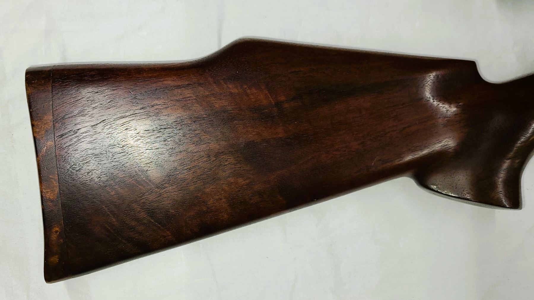 style wood stock. Stock as meallion of bullet casing head that reads Herters 45-70.