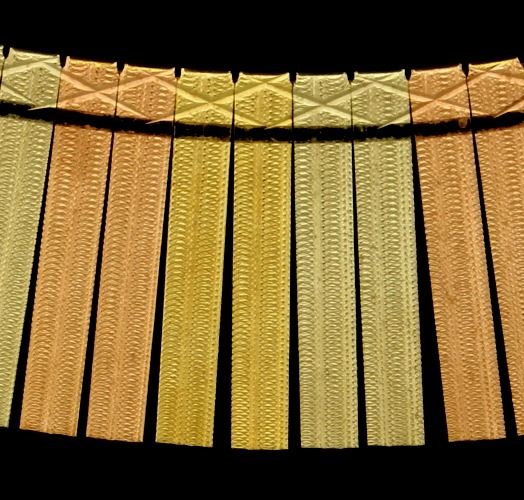 In 14K gold, the necklace is 16 inches long and up to 7/8 inch thick. Is has a safety clasp. 35.1g