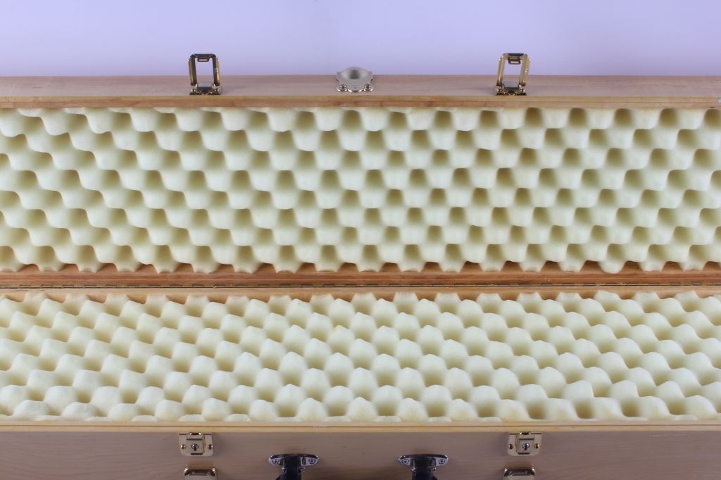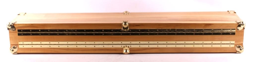 This is a custom made gun case. It is made from solid maple. The case has two compartments with capacity to hold a rifle up to 50.5" long. The case is accented well by the brass hardware. The maple gun case is in good condition. The two compartments measure 8.5" x 50.75". The case measures 7.5" x 10" and is 52.5" long.