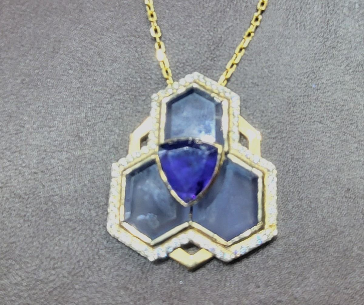 This 18 karat yellow gold necklace is a one-of-a-kind, custom-made piece. Suitable for a man or a woman, the link necklace is 24" long (12" on each side) and connects to the pendant on each side, adding an approximate 2" to the length. The chain closes with a lobster clasp. The pendant was designed by the original owner, and hand-crafted by a local jeweler. Approximately 15mm x 12mm slices of light lavender-colored, natural chalcedony serve as a backdrop for a 3.94 carat, trilliant-cut, natural, bluish-violet, bezel-set Tanzanite. A blazing border of .51 carats total weight round, brilliant-cut, D color, VVS2, natural diamonds present a regal finish for this unique necklace. With a weight of 28 grams, this necklace proves to be an "heirloom" quality necklace. An up-to-date insurance appraisal is included with this necklace. Admin: CKP1/18.irrr