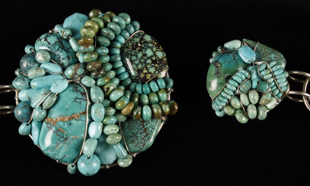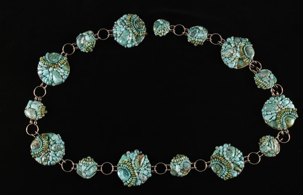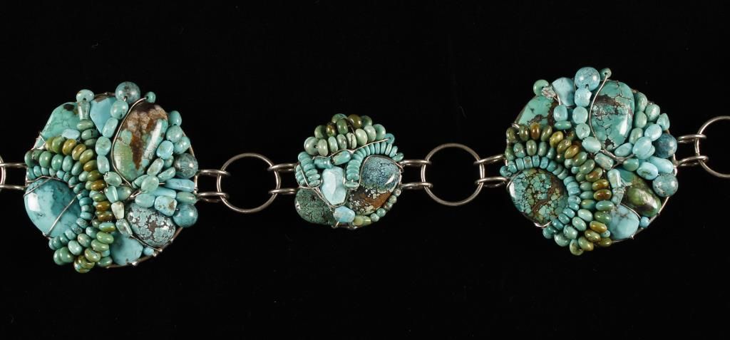 with wire wrapped turquoise, beautiful design and a one of kind piece. Measures 49" Long, each bigger concho is 3" round and the smaller conchos are 1 1/2 each. 7 large and 8 small conchos.