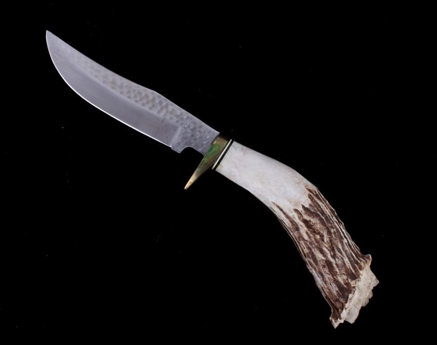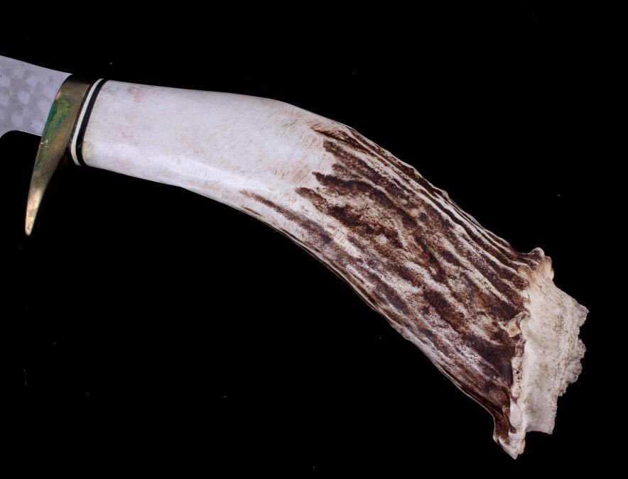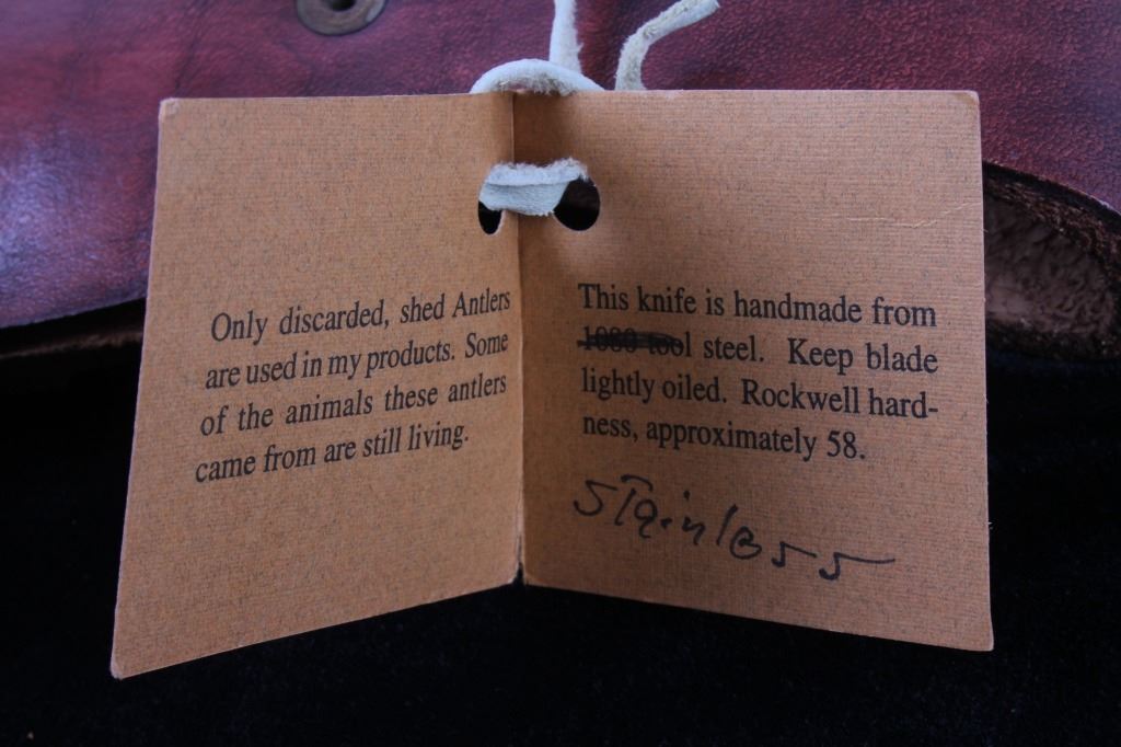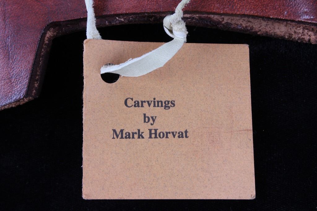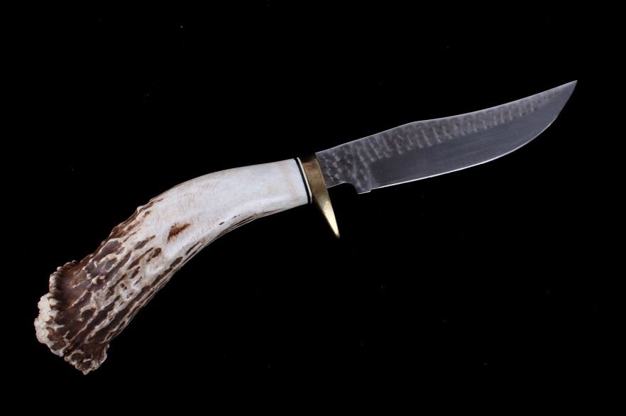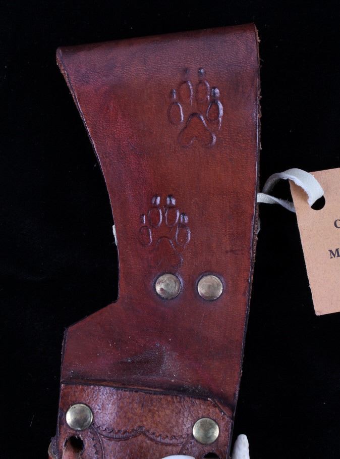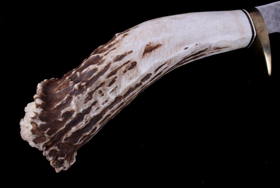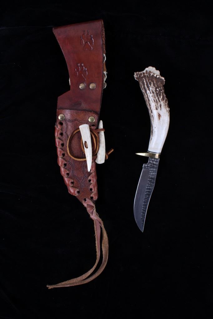For your consideration is a custom made stag antler grip knife and leather sheath by Mark Horvat. This unique creation by one of America’s most respected artists features a polished stag or elk antler grip with a solid brass cross piece. The clip point blade design shows a machined steel. The expertly crafted knife is carried in the custom leather scabbard. The leather scabbard shows two paw stamps on the belt loop, and a hand sewn seam around the edge. There are four brass rivets holding the leather layers together. On the decorative scabbard are two small antler tines held on by a leather strap that can be used to secure the knife. Overall this piece is in great condition. It measures 10.5" overall length, the knife has a 5" antler grip, and the blade measures 4.5"