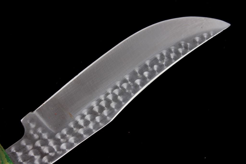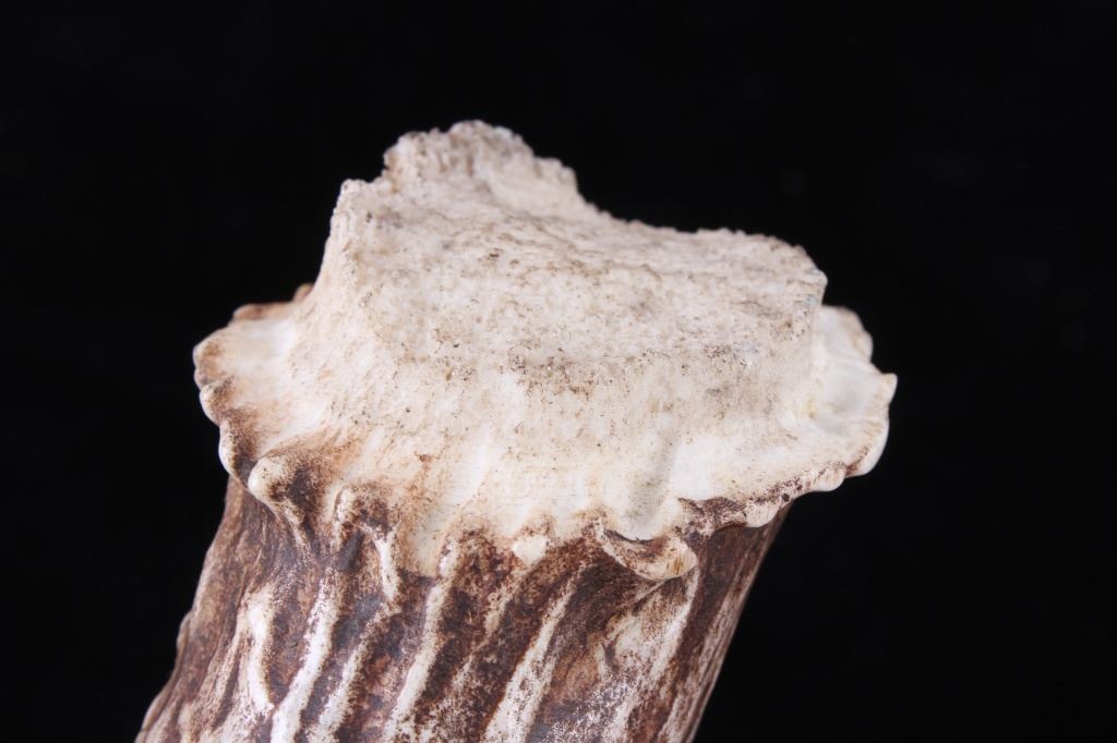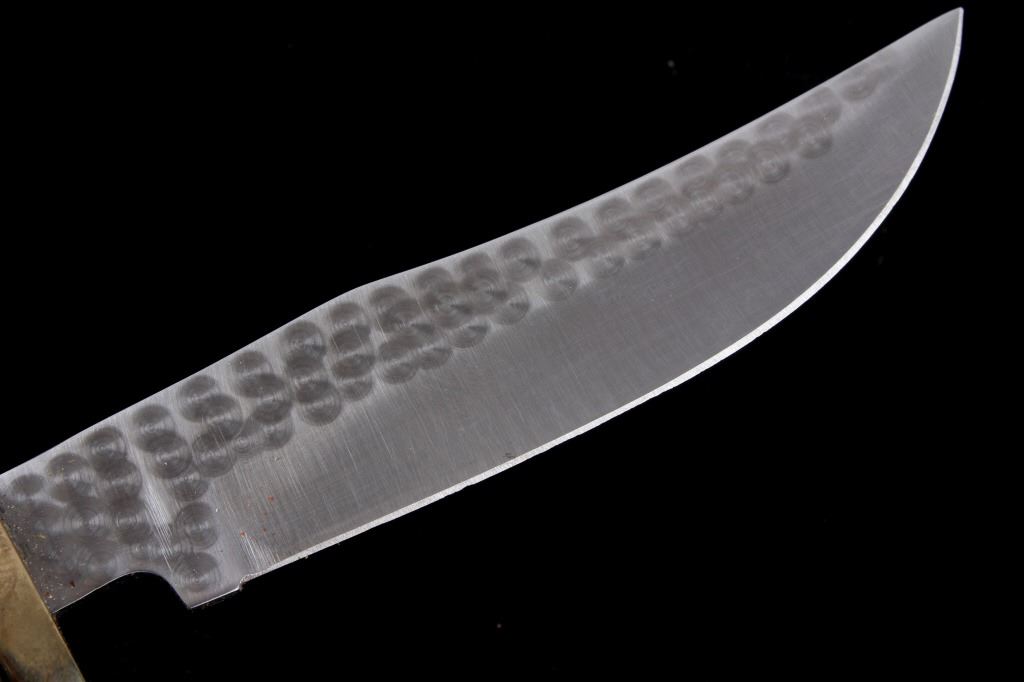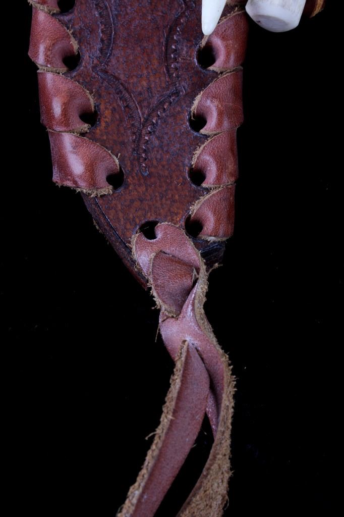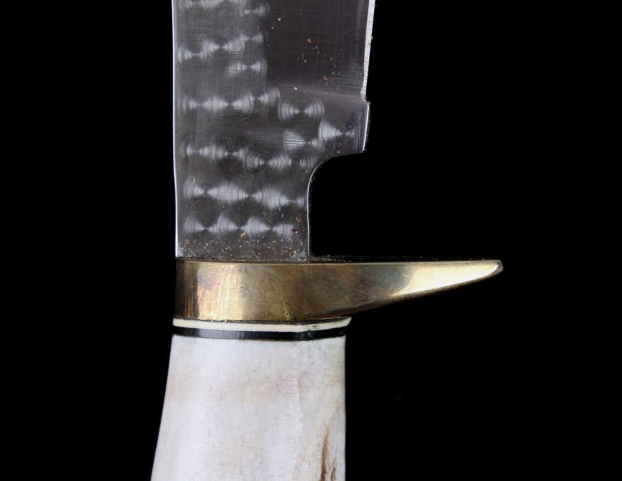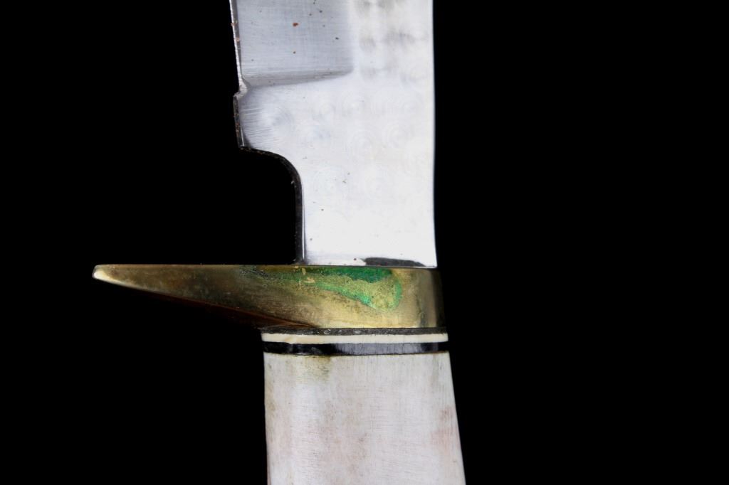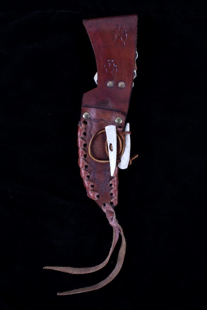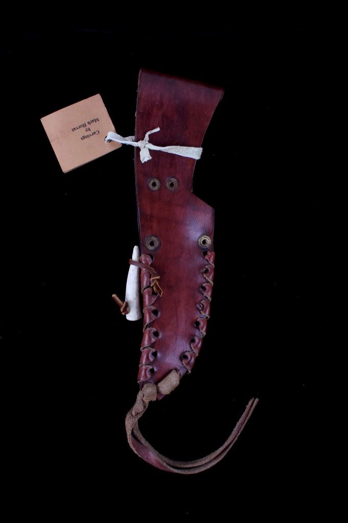 For your consideration is a custom made stag antler grip knife and leather sheath by Mark Horvat. This unique creation by one of America’s most respected artists features a polished stag or elk antler grip with a solid brass cross piece. The clip point blade design shows a machined steel. The expertly crafted knife is carried in the custom leather scabbard. The leather scabbard shows two paw stamps on the belt loop, and a hand sewn seam around the edge. There are four brass rivets holding the leather layers together. On the decorative scabbard are two small antler tines held on by a leather strap that can be used to secure the knife. Overall this piece is in great condition. It measures 10.5" overall length, the knife has a 5" antler grip, and the blade measures 4.5"