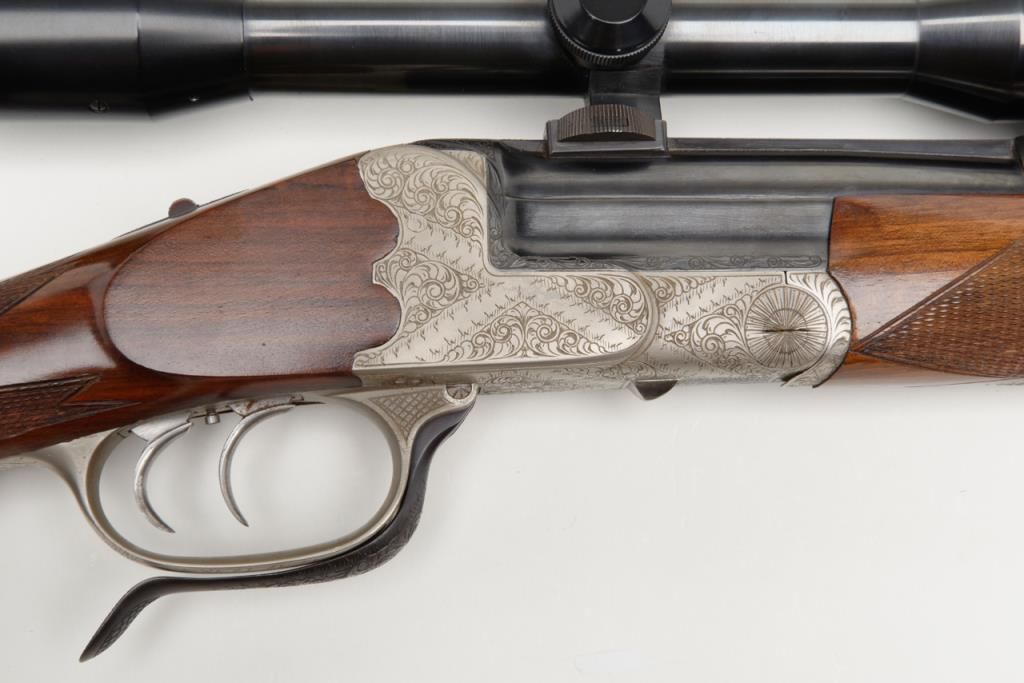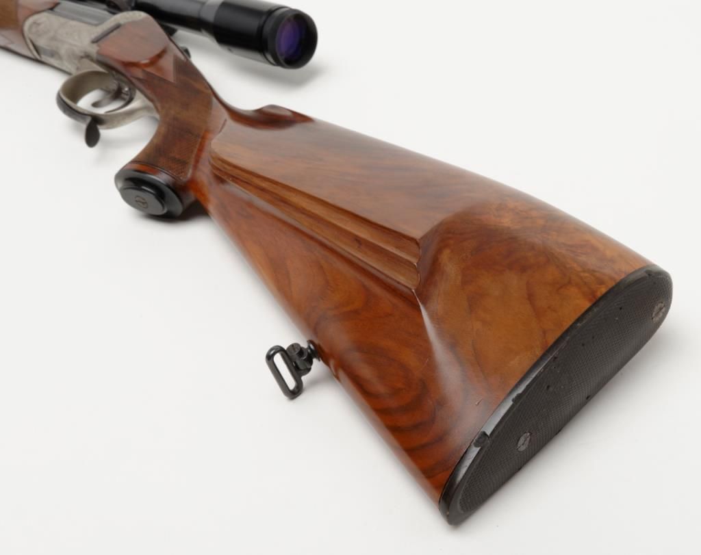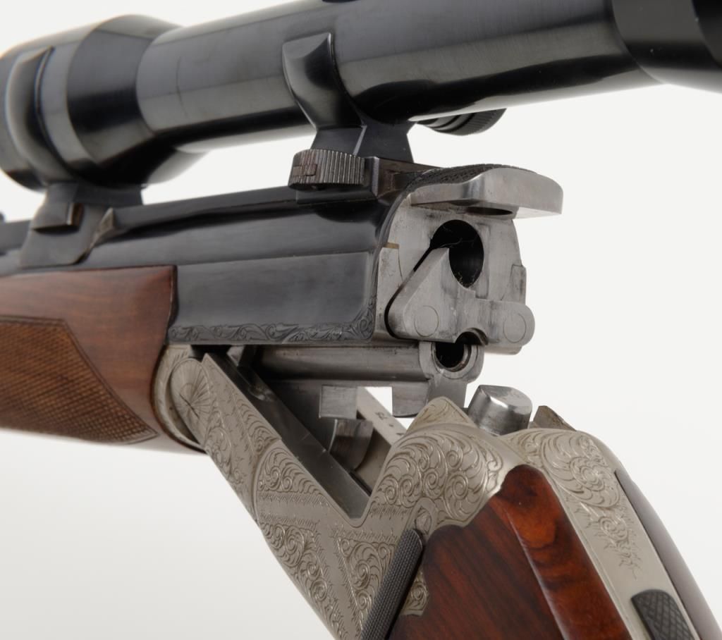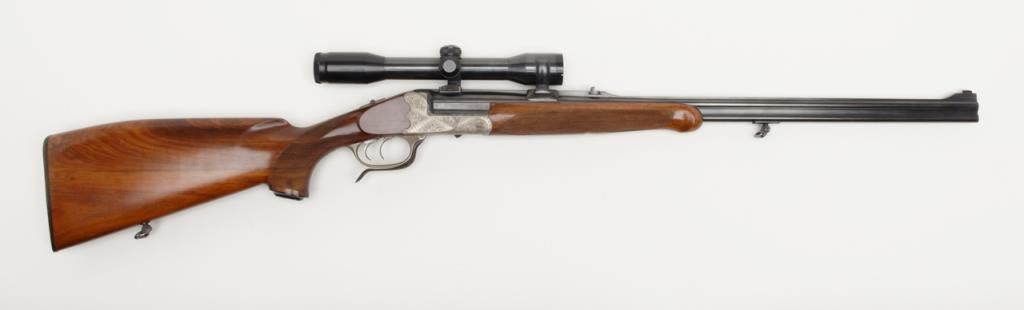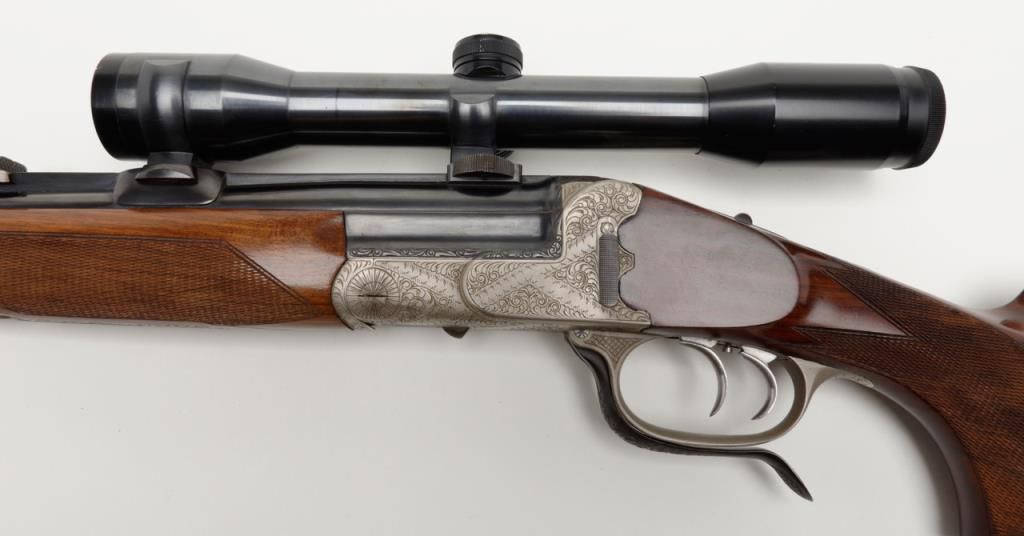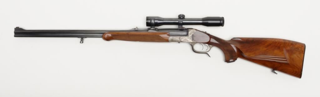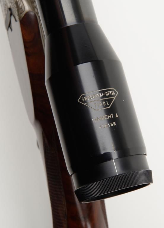 Custom Martin Hagen over/under rifle, cal. .243 Winchester and .22 Magnum, Serial #771. Manufactured in 1972, the rifle is in overall fine, nearly excellent condition. The 24 1/2” Bohler steel marked barrels retain nearly all oftheir blued finish, with a full length, filed rib. The scalloped action is beautifully scroll engraved with a matte, coin finish and stalking safety. The finely checkered wood stocks are expertly done with highly figured walnut, in aGerman” Hogback” style with Bavarian cheekpiece. The grip cap and butt plate are completed in horn and sling swivels have been added. The bores are fine, action tight and markings sharp. The rifle is topped with a Swarovski fixed 4 X scope incustom claw mounts. A beautiful custom, German rifle with an estimated replacement cost of over $20,000. (Modern/PPT). Est. : $7,000-$14,000.