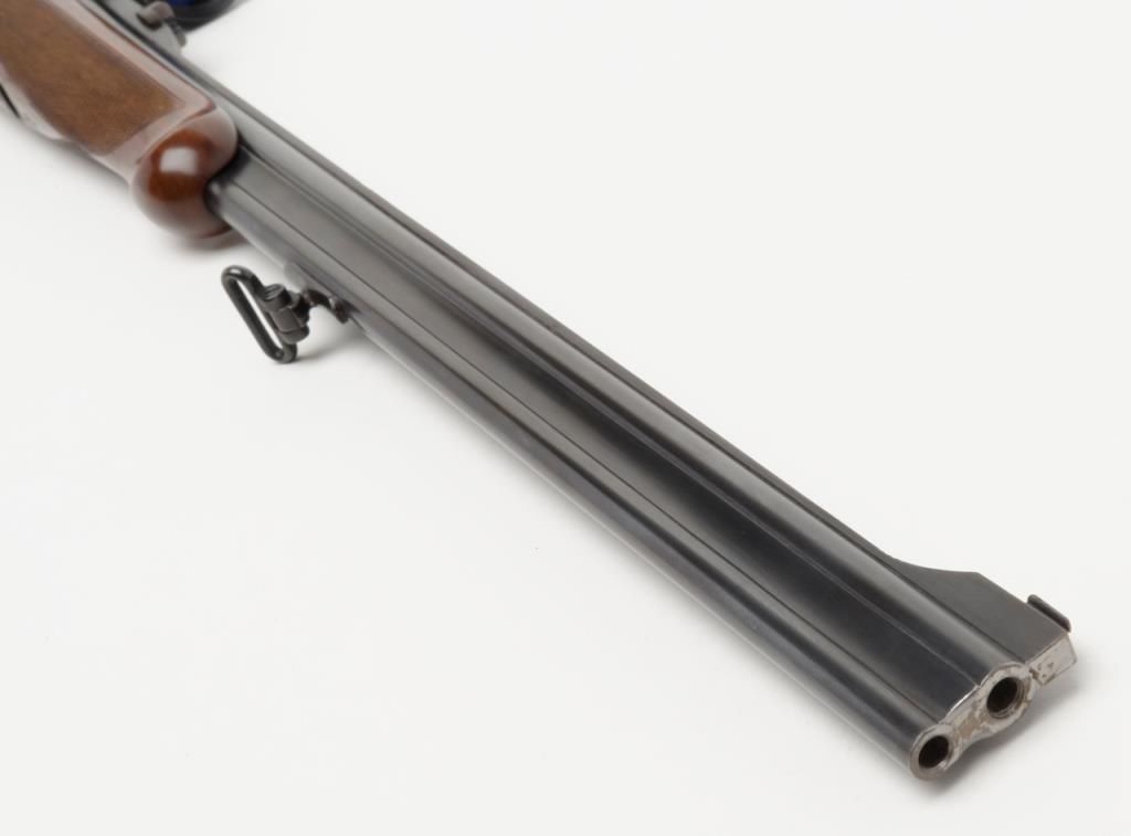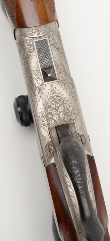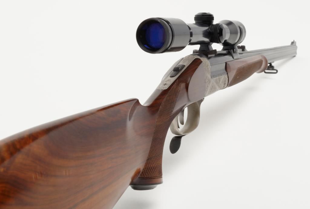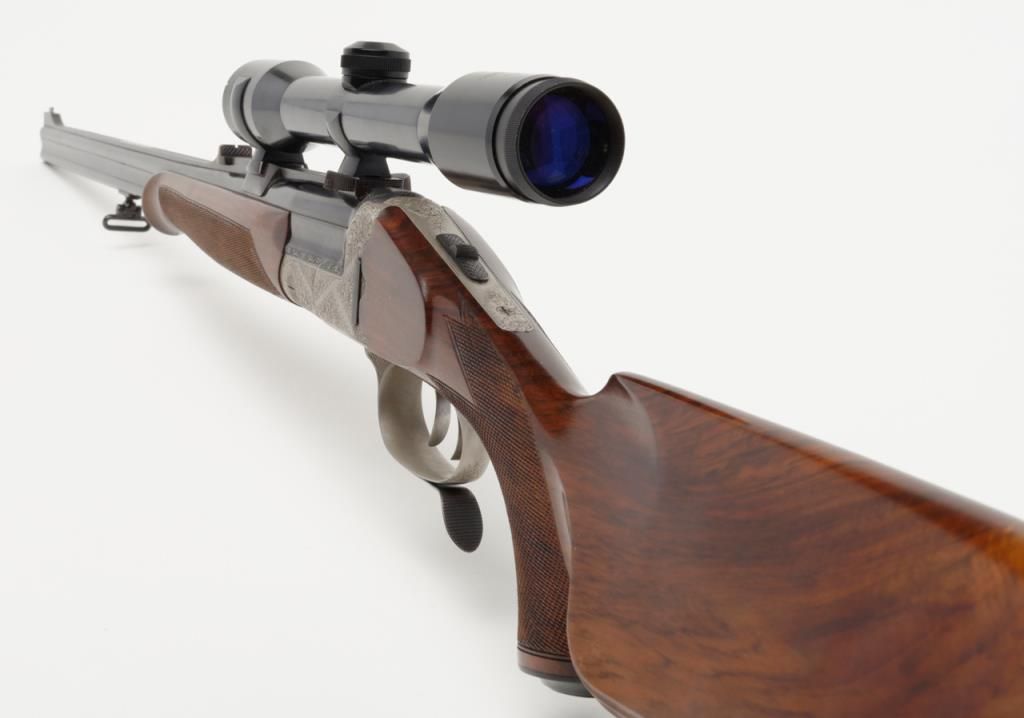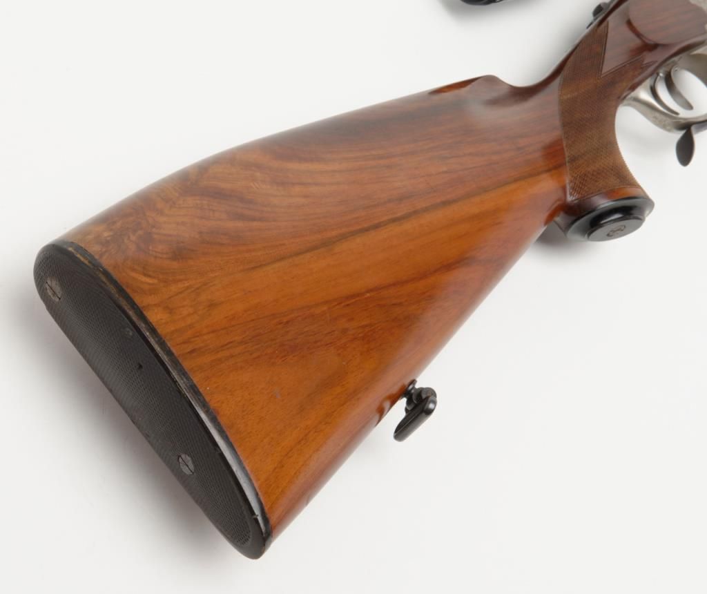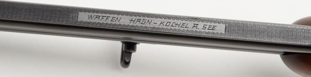 Custom Martin Hagen over/under rifle, cal. .243 Winchester and .22 Magnum, Serial #771. Manufactured in 1972, the rifle is in overall fine, nearly excellent condition. The 24 1/2” Bohler steel marked barrels retain nearly all oftheir blued finish, with a full length, filed rib. The scalloped action is beautifully scroll engraved with a matte, coin finish and stalking safety. The finely checkered wood stocks are expertly done with highly figured walnut, in aGerman” Hogback” style with Bavarian cheekpiece. The grip cap and butt plate are completed in horn and sling swivels have been added. The bores are fine, action tight and markings sharp. The rifle is topped with a Swarovski fixed 4 X scope incustom claw mounts. A beautiful custom, German rifle with an estimated replacement cost of over $20,000. (Modern/PPT). Est. : $7,000-$14,000.