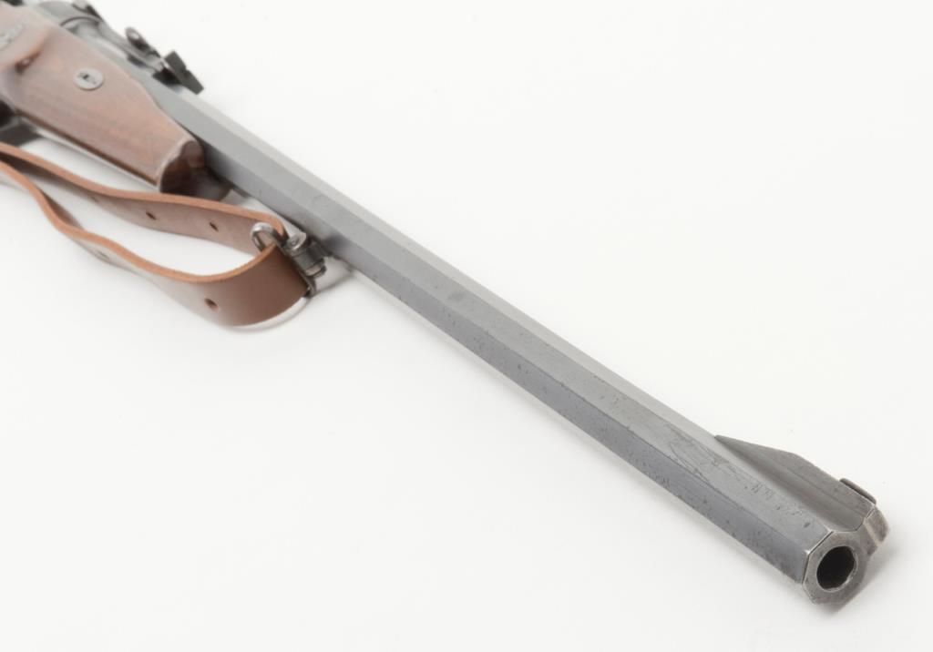 Custom Mauser 1888 sporting rifle, 9mm caliber, Serial #NSNV. The rifle is in overall very good condition with a 23” octagon barrel. Marked “Val Hafner”, the barrel and action retain the majority of their blued finish. The barrel has a rampfront and folding rear sights with a full-length hand filed rib. Additionally, the rifle has been fitted with custom bases for a claw mount scope. The finely checkered wood stock features high grade wood with a Prince Edward pistol grip, sling swivels, metal crescent butt plate and cartridge trap in the butt stock. The rifle has engraved screw heads and an integral, fixed five round magazine. The bore is very good, the action crisp and markings sharp on this fine old Mauser.Est.: $600-$1,200.