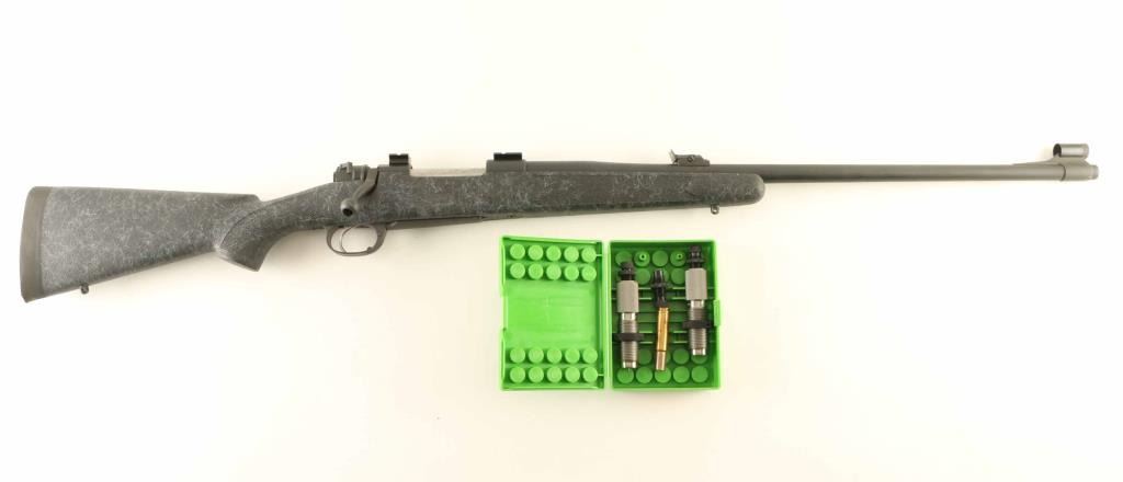 Bolt action rifle appears custom built on a military Mauser action. Features matte blued finish, Composite stock, 25" medium-heavy profile barrel, band type front sight base with blade insert & hood, adjustable rear sight mid-barrel, two piece Weaver type scope bases affixed to top of receiver (no rings, no scope), bent bolt handle, Dakota type bolt shroud with side-swing low profile three position safety, hinged floorplate. Stock (McMillan type composite) is textured black finished with contrasting blue drizzle pattern, with sling studs, solid recoil pad, impressed checkered panels at wrist & forend. Bore is excellent. Retains 95% blued finish with scuffs, bare metal on sharp edges. Stock is excellent. Includes die set for the 411 Bert wildcat cartridge. Condition is NRA Excellent as rebuilt *** Modern Firearm ***