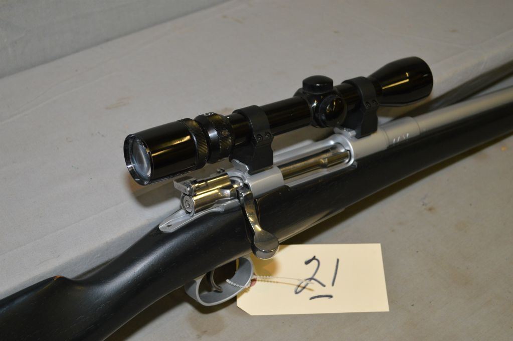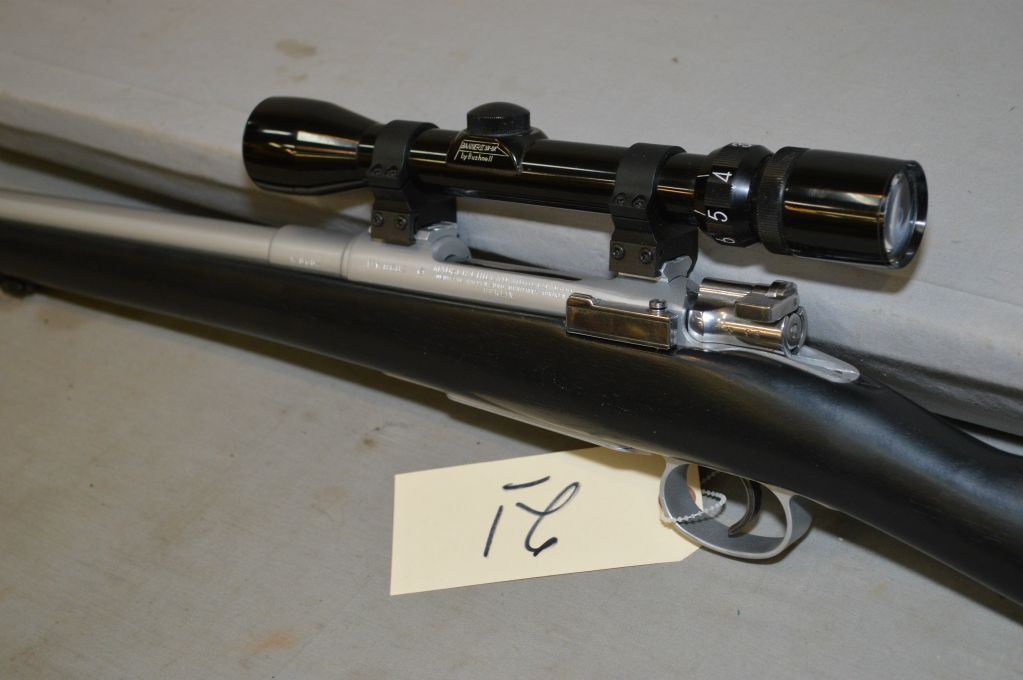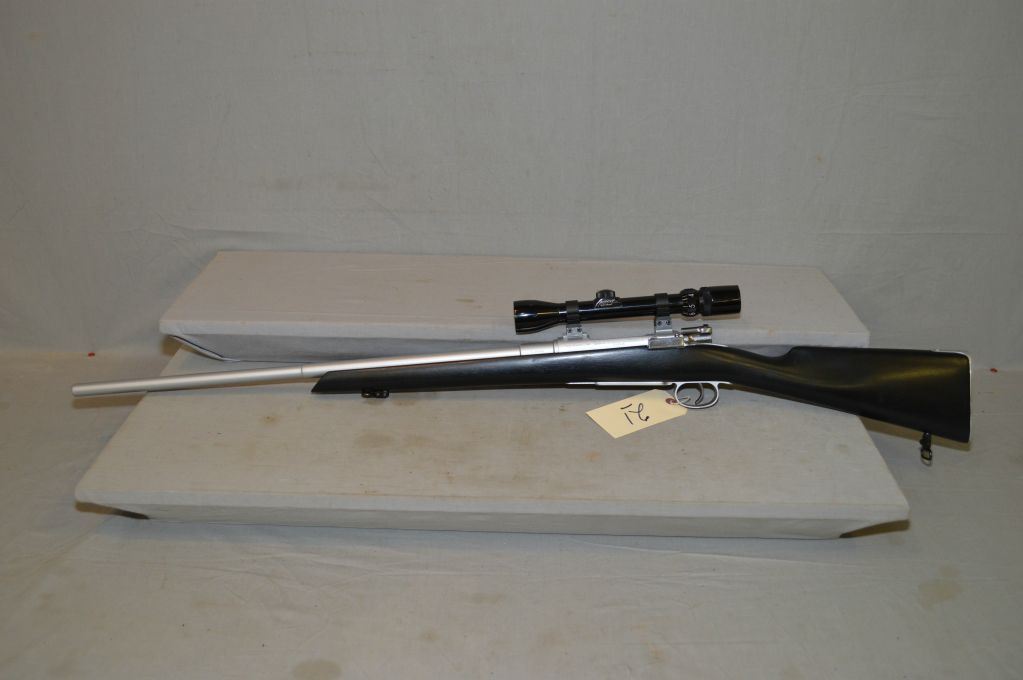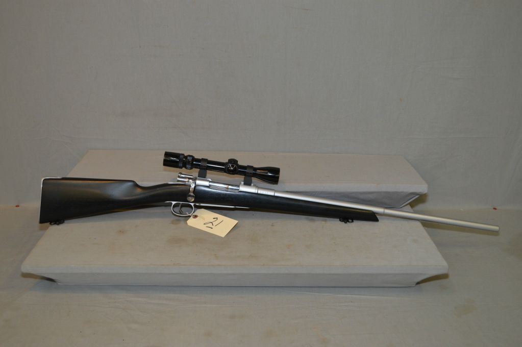 Custom Mauser ( Built on Chilean Model 1893 Action) .7 x 57 Cal Bolt Action Rifle w/ 25 1/2" bbl [ silver grey finish, w/ custom bolt handle, wooden stock stained black, no sights, but has Bushnell Banner 3 x 9 scope, in black rings, black quick off swivels ] Ser # L8682