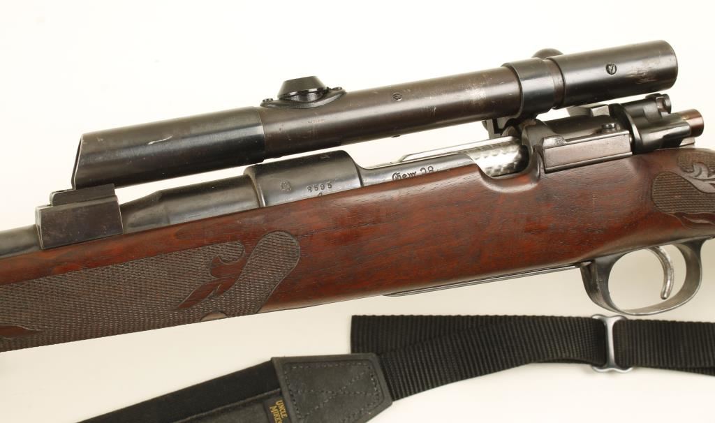 Blued bolt-action with a 23" barrel, a wood American Classic stock, a scope, sling and recoil pad. LOP is 13-1/2". Bluing has faded to grey with freckles of surface rust and light pitting. Receiver was made at Danzig arsenal in 1915. Numbers on bottom metal and floorplate don't match the receiver number but the floorplate is hinged. Bore is pristine with strong rifling. Crown is military round crown and has a little pitting. Low scope safety appears to have been handmade. Bolt body, follower and extractor are jewelled. Stock is a dark stained hardwood with lots of fiddleback in the butt. Carved wood and checkered panels on the wrist and forend and the checkering is still sharp. There is a shadow line under the cheek rest. There are two notable dings, one near the bottom metal and one near the forend cap. Other marks are small scratches and dings. Forend cap, grip cap and recoil pad all have white line spacers. Recoil pad spacer is larger than the stock. Grip and forend caps are smaller than the stock. Scope is marked "Germany" only. There are no maker or power markings. Rear scope mount is cantilevered off the right side of the receiver bridge and has a knob to adjust windage. There is an adjustment for elevation on top of the tube. The reticle is a 3-post type. Power is about 2X. QD sling swivels. Action works well. Condition is very good. *Modern Firearm*