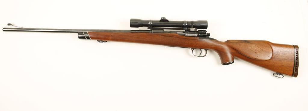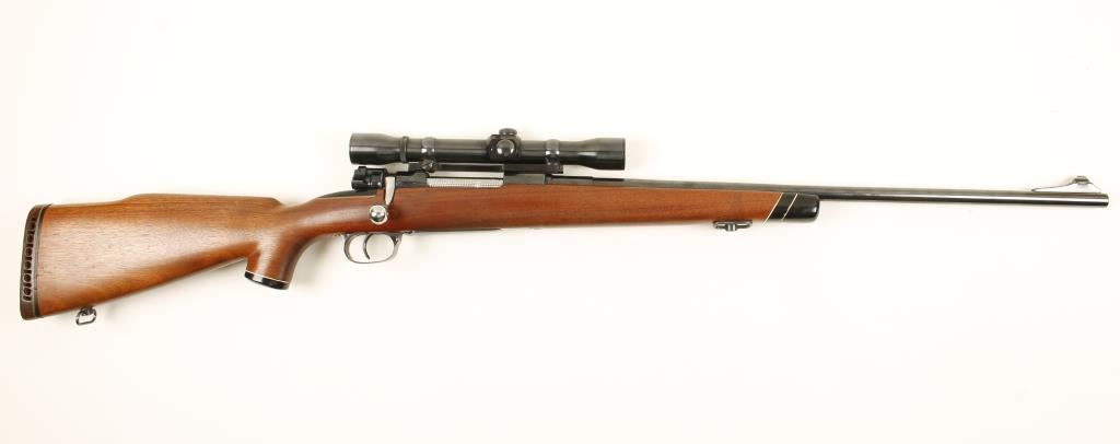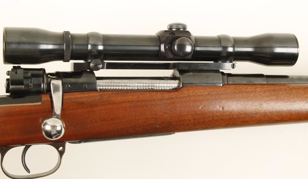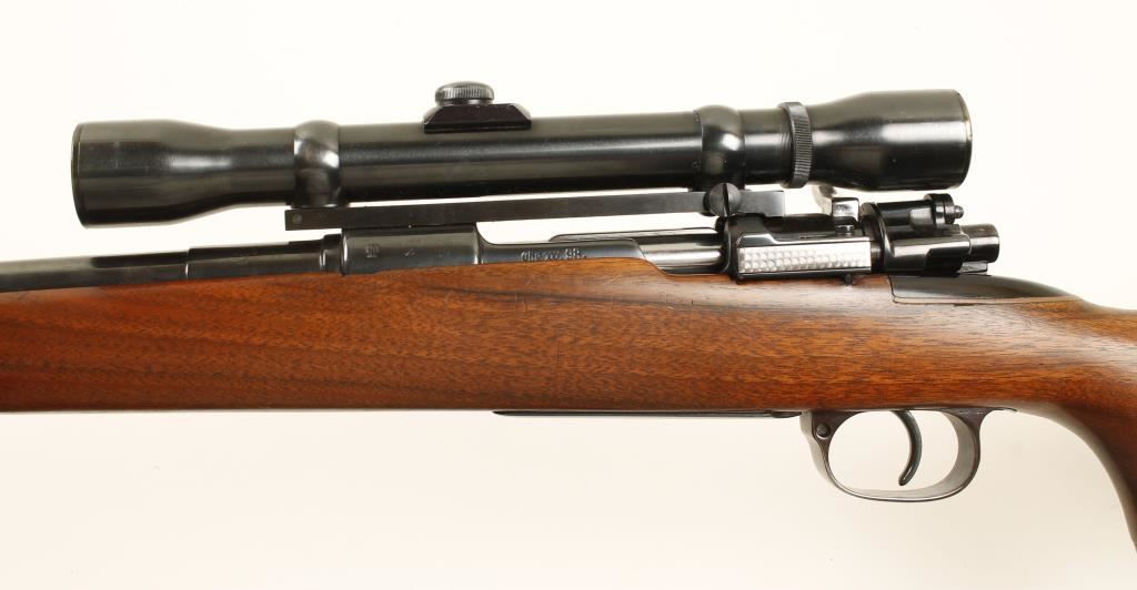 Rifle built on a military Mauser 98 action with Imperial proofs. Blued bolt-action custom rifle with a 23-3/4" barrel and a scope. Metal has been polished and re-blued and has some scratches with freckles of surface rust. The bolt handle has been bent down and a low scope safety has been added. The scope is a Weaver K4 on a Buehler base. Stock is an American Classic with cheek rest for a right handed shooter. There was a diamond shaped item inlaid in the cheek rest which is missing. The butt pad has ossified. Wood is in good shape with a few little storage/transport scratches, rubs and dings. Bore is bright but may have some small pitting in it. Action works well. Condition is good. *Modern Firearm*