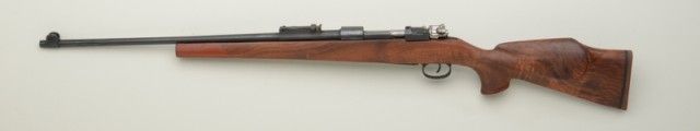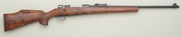 Custom Mauser K-29 bolt-action rifle, 8mm cal., 24” barrel, re-blued finish, custom wood stock with red hard rubber butt pad and deluxe graining to the butt stock, #32608. This gun is in overall very good condition as customized with a crisp action, very good bore and beautiful wood stock. Est.: $250-$500.