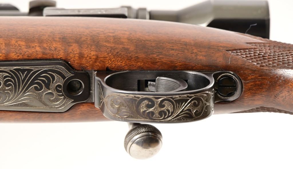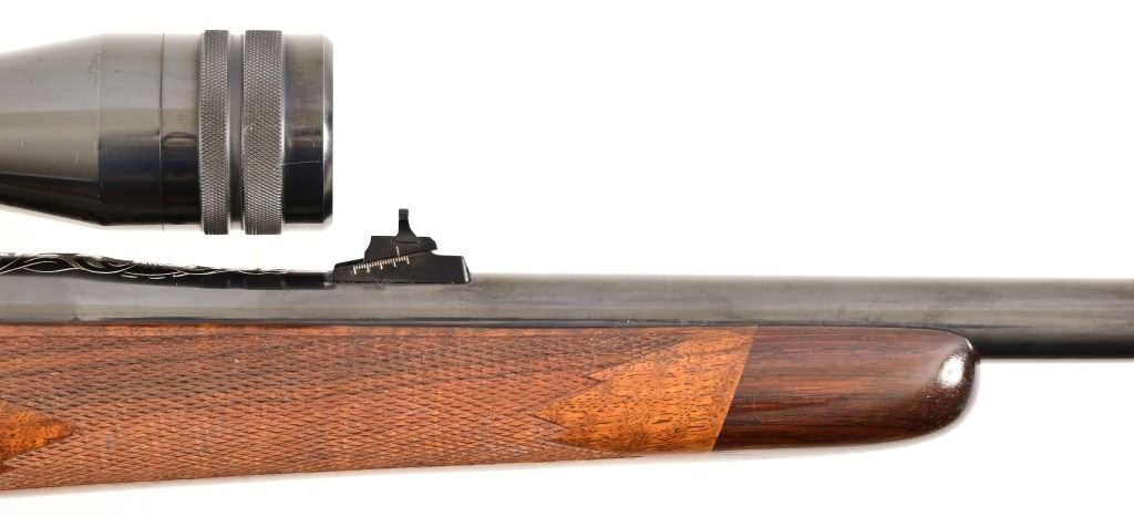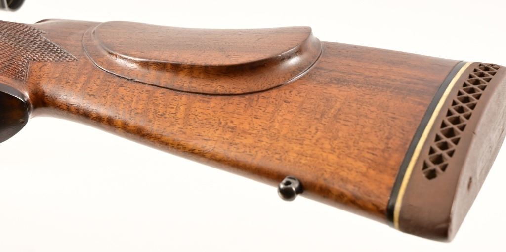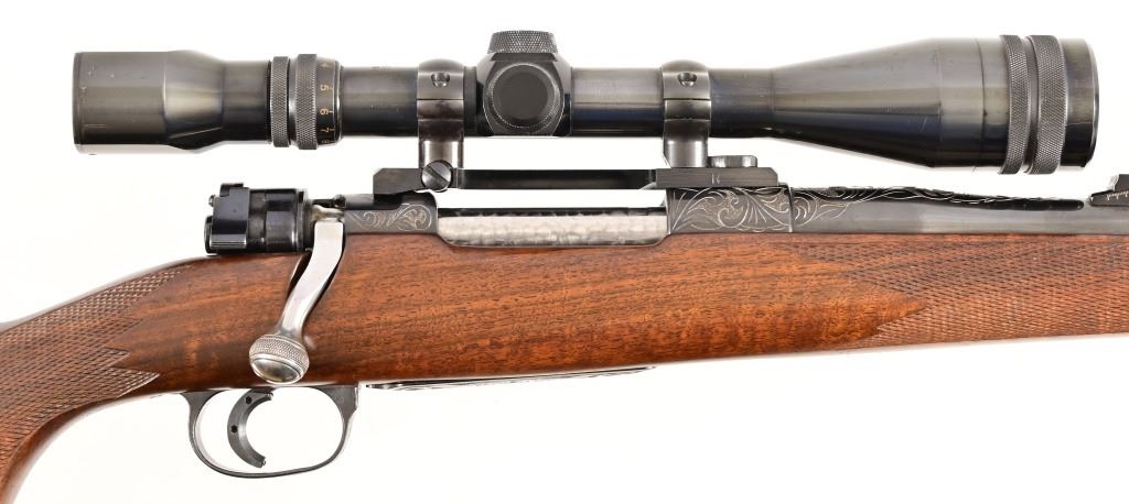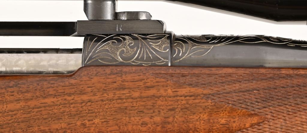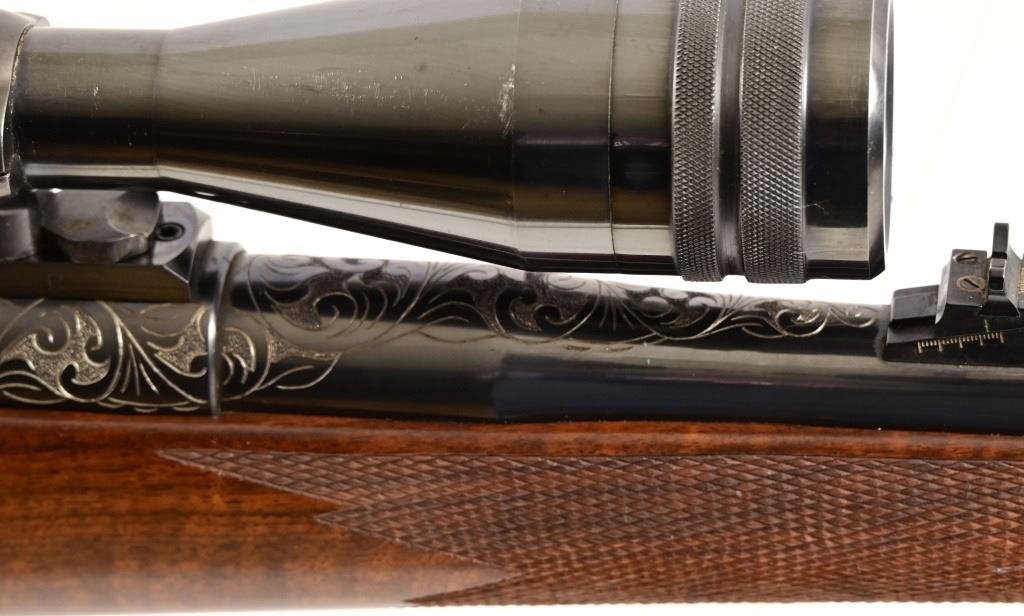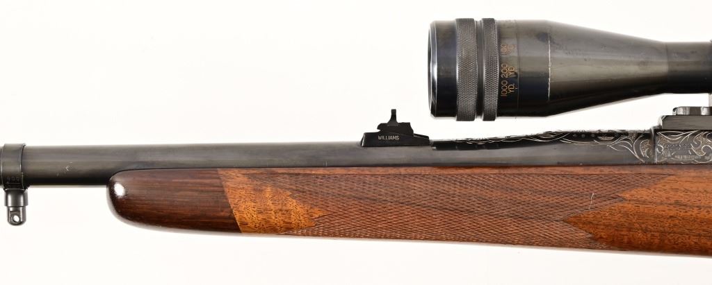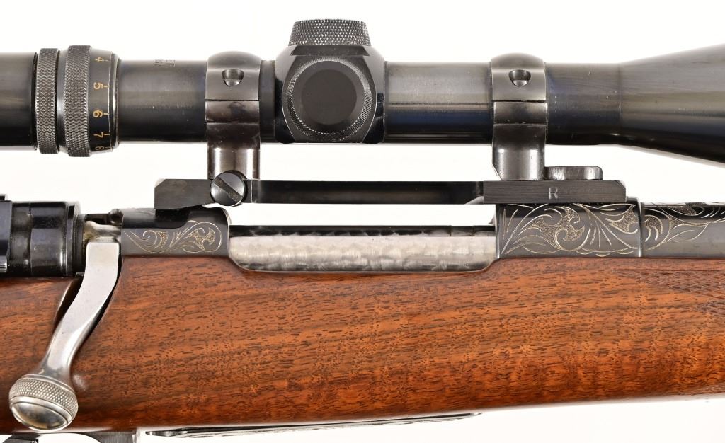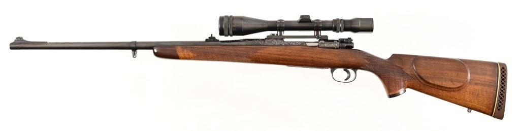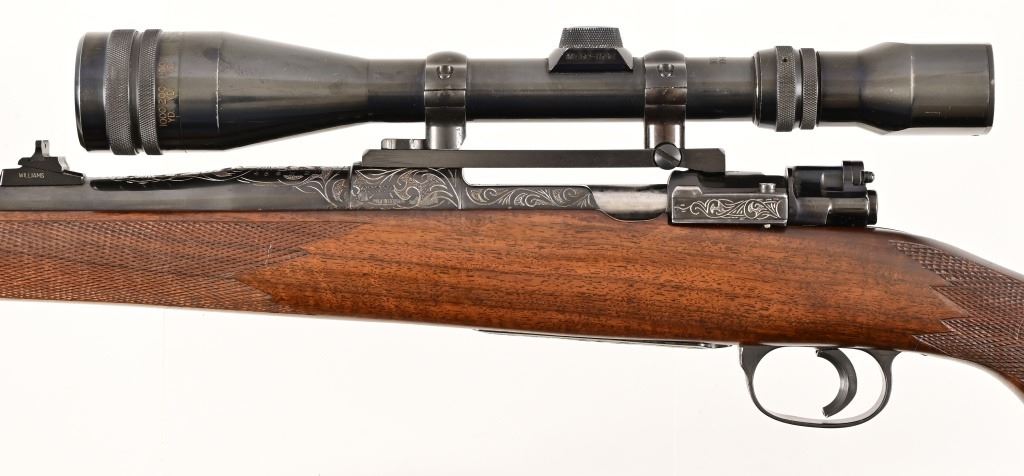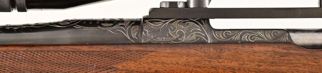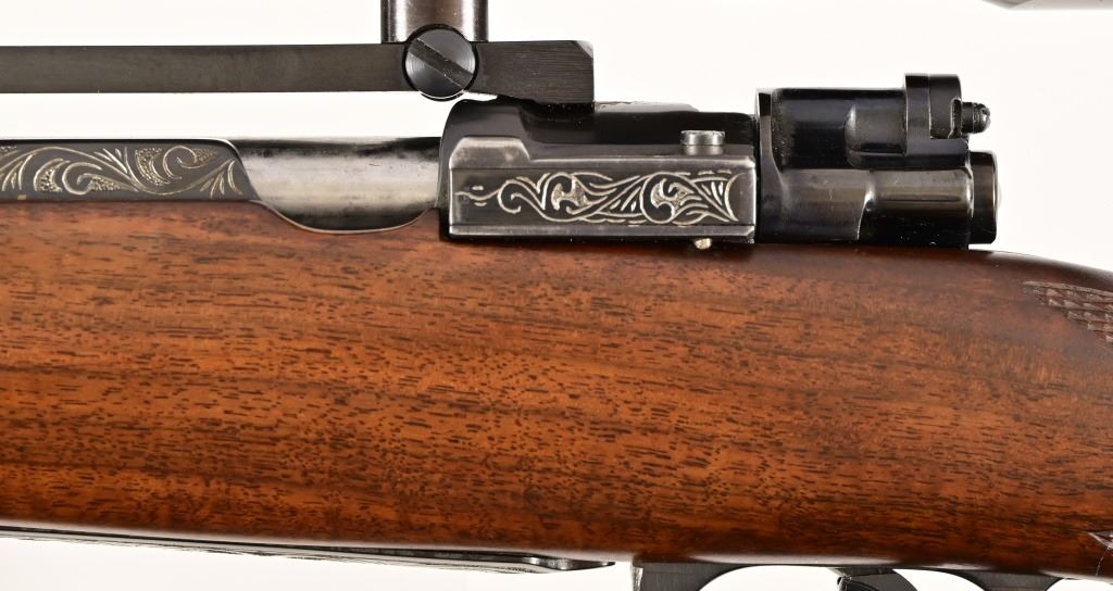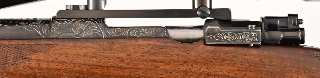 SN 62091. No makers marks. Beautiful custom rifle, engraved receiver, barrel and bottom metal. Jeweled bolt and extractor. High grade walnut stock. Custom trigger. Comes with Weaver 3x9 scope and sling. Modern.