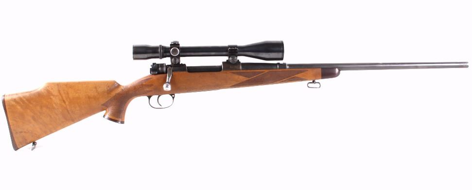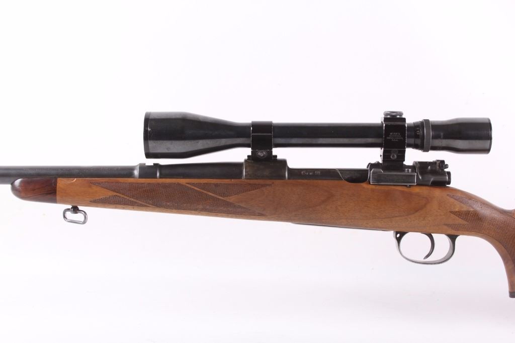 Offered for sale is a custom Mauser and Winchester rifle chambered in .220 Swift with a Weaver Scope. The rifle is a Mauser 1918 98 action with a pre-64 Winchester model 70 barrel chambered in .220 Swift. The rifle features a blued steel finish, custom bolt handle, skip line checkering , and custom monte carlo stock. The rifle is in good condition, with loss of bluing on the receiver and barrel. The stock is in good condition with some handling and use wear. Curio & Relic rifle. FFL transfer or NICS background check required. Serial number is 3594. Overall length is 42 1/4"