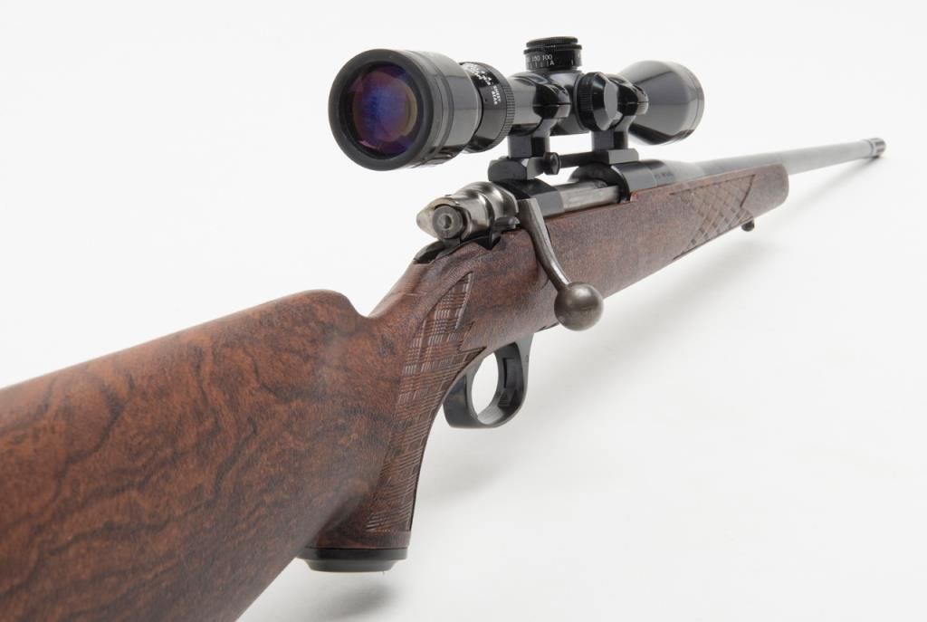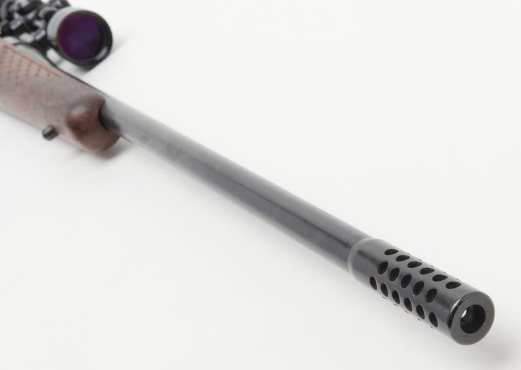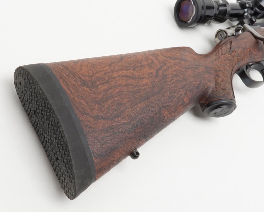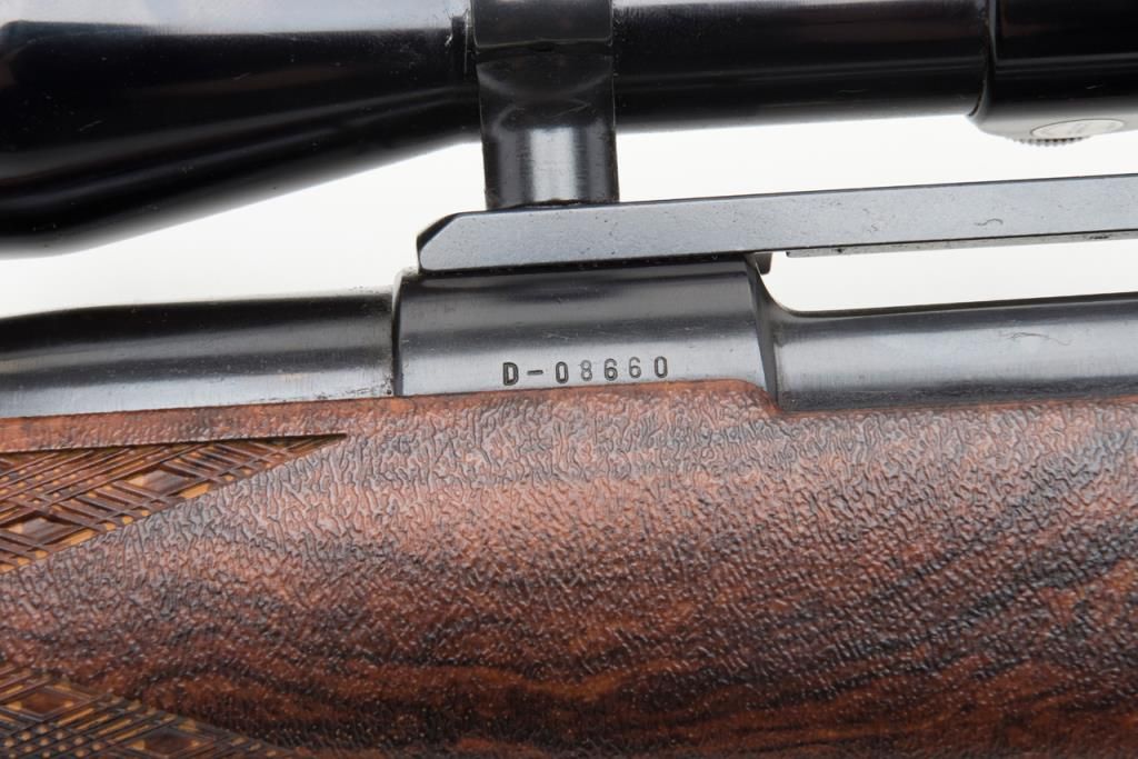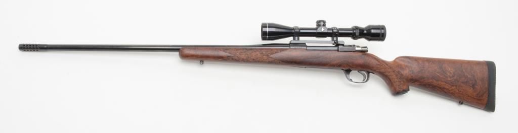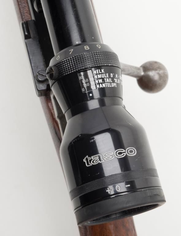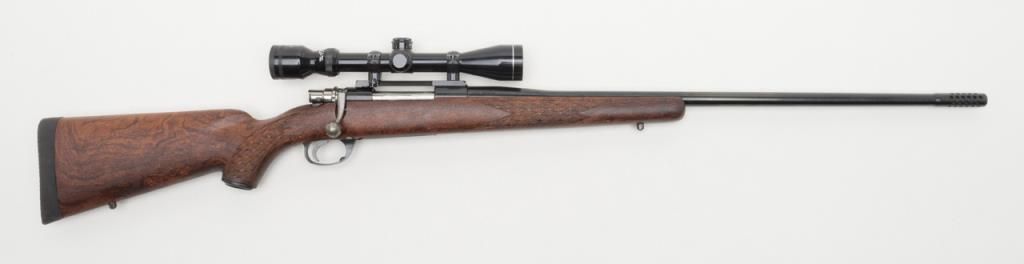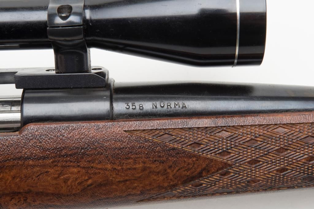 Custom Mauser bolt action rifle, .358 Norma caliber, Serial #D-08660. The rifle is in overall very good condition with a 27” blued barrel with muzzle break. The barrel and action retain nearly all of their blued finish with the bolt in thewhite. The synthetic stock is in excellent condition with sling swivel studs and a Decelerator butt pad. The bore is excellent, action crisp and markings sharp. The rifle is topped with a one-piece scope mount and Tasco 3x9variable power scope. A nice custom Mauser in a great caliber that appears to have seen little use. (Modern/PPT). Est.: $250-$350.