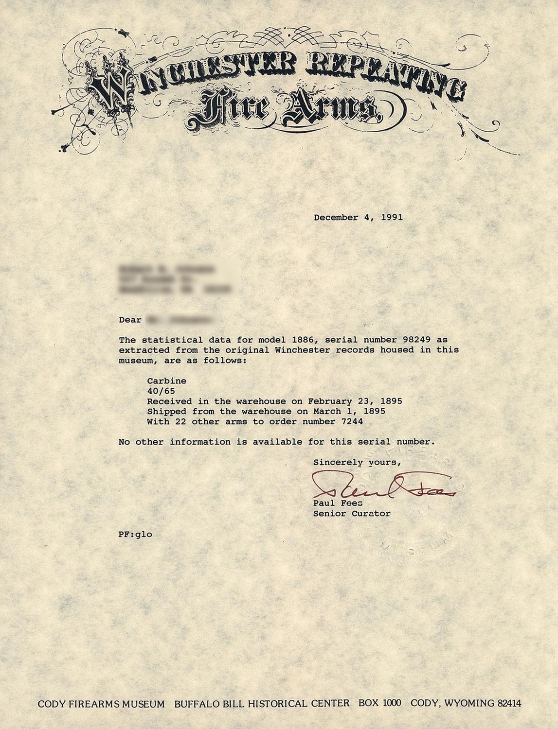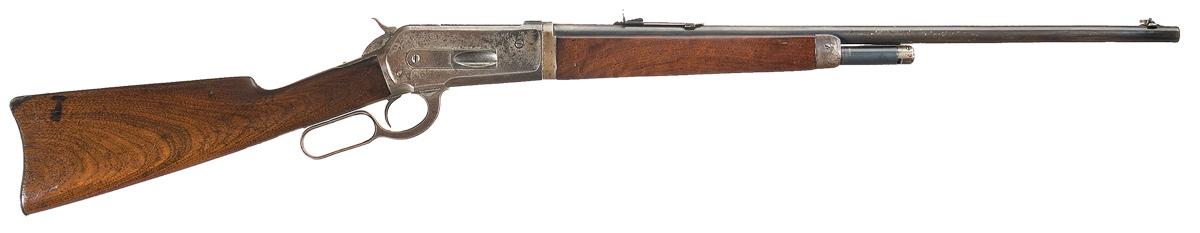 This is a period modified example of a Winchester Model 1886. Factory letter confirms carbine configuration, 40-65 caliber, (rifle is now a 45-70 smooth bore!), that it was received in the warehouse on February 23, 1895 and shipped with 22 other arms on March 1, 1895. No mention was made of the takedown feature. The rifle features a folding globe front sight and adjustable rear buckhorn sight, takedown action with half magazine, saddle ring and stud mounted on the left side of the receiver and mounted with a smooth forearm with iron end cap and straight grip stock with a carbine buttplate. The top of the barrel is marked "MANUFACTURED BY THE / -WINCHESTER REPEATING ARMS CO. NEW HAVEN CONN. U.S.A.-" ahead of the rear sight and "45-70" at the breech. The serial number and two patent dates are marked on the lower tang, and "--MODEL 1886--" on the upper tang. The receiver, hammer and lever were casehardened and the remaining parts blue.
