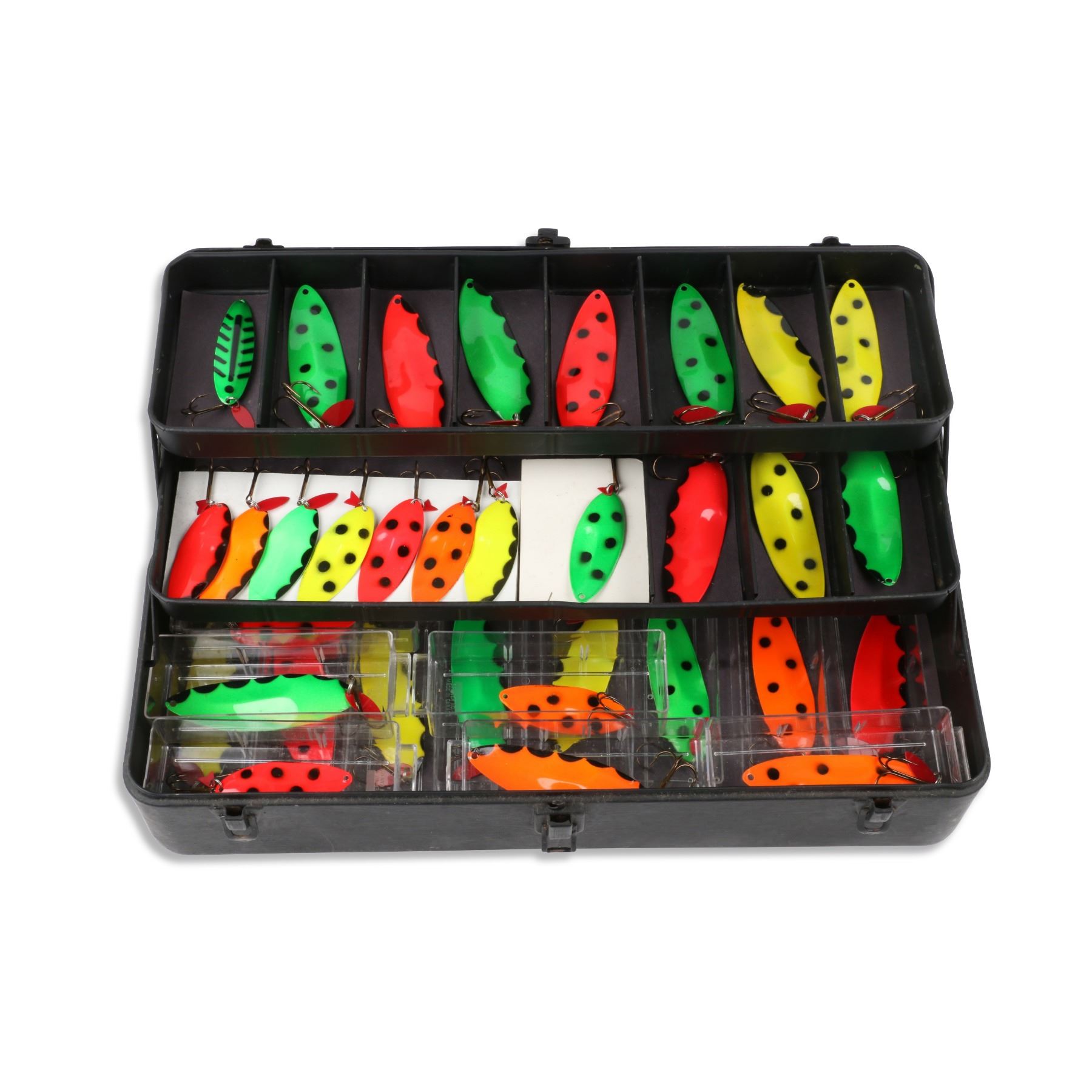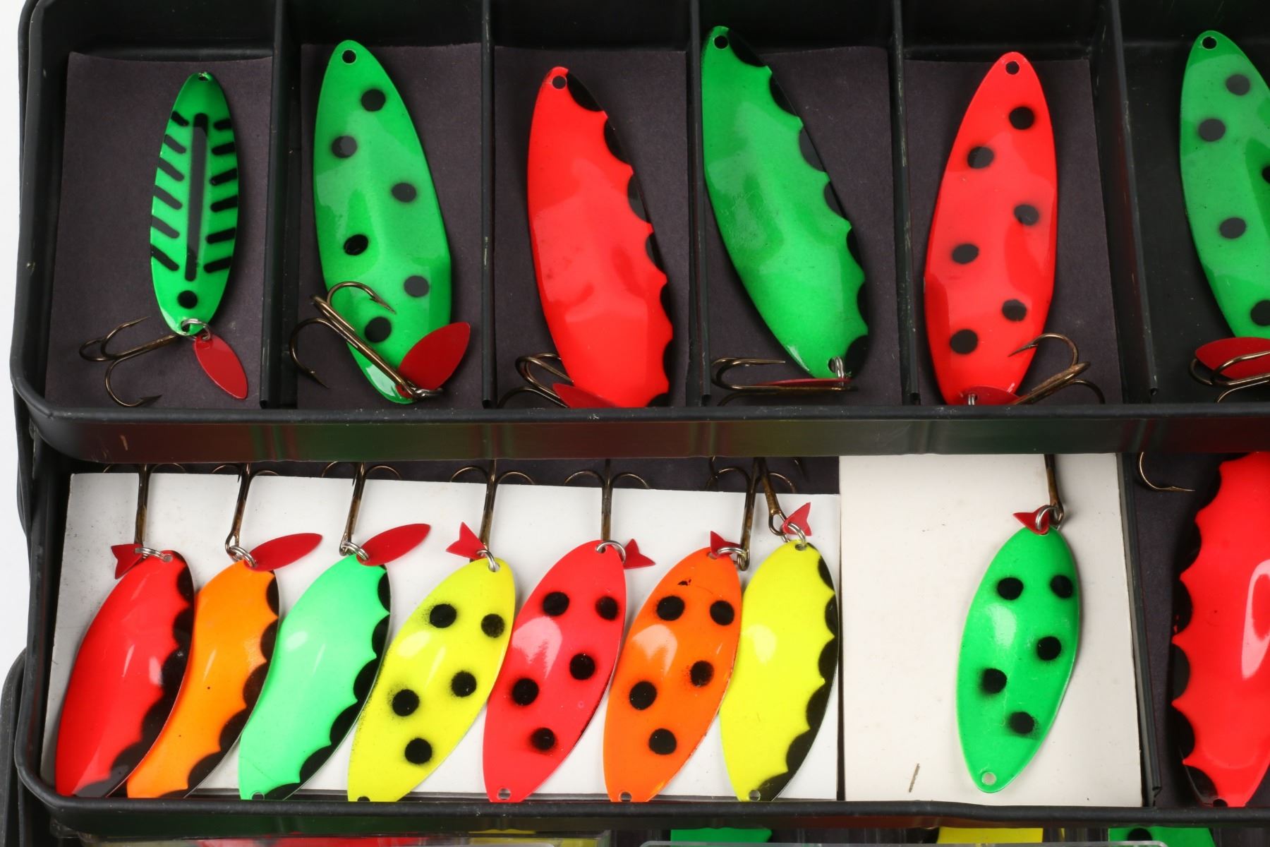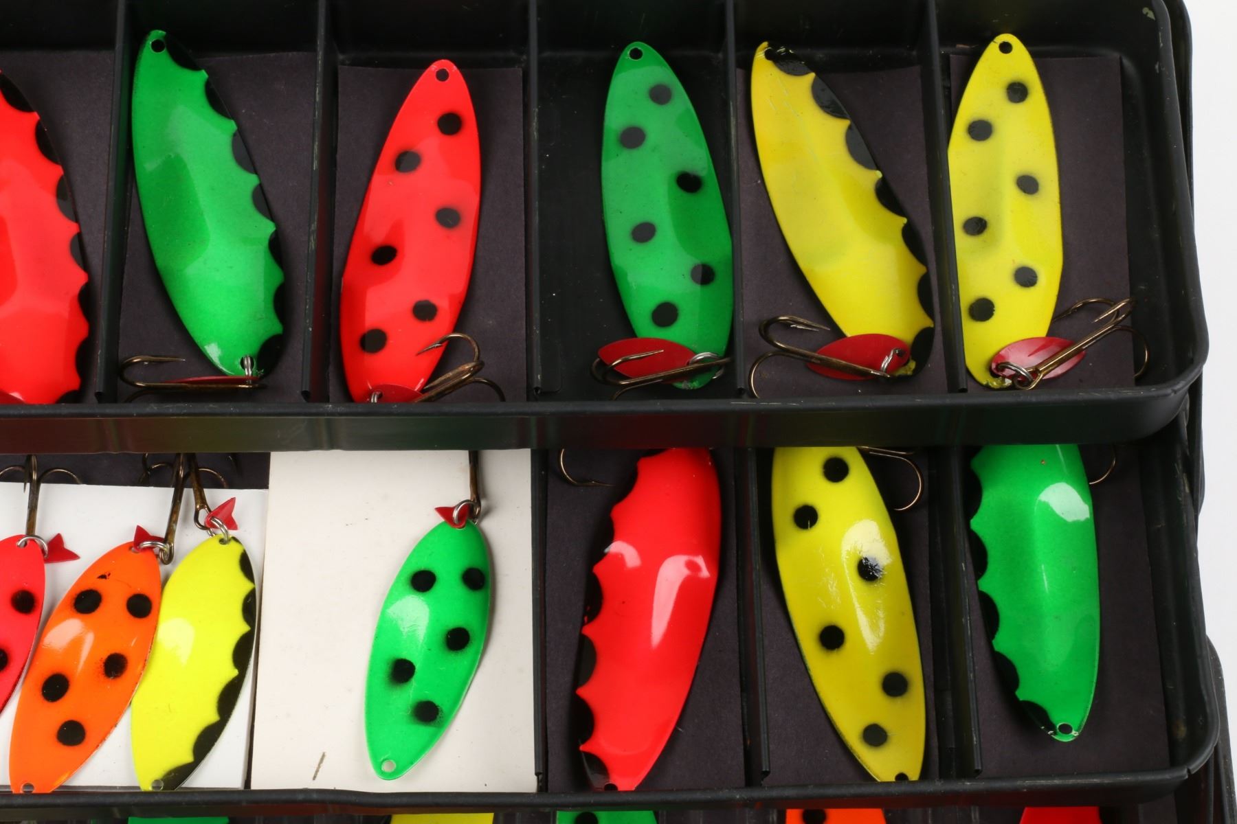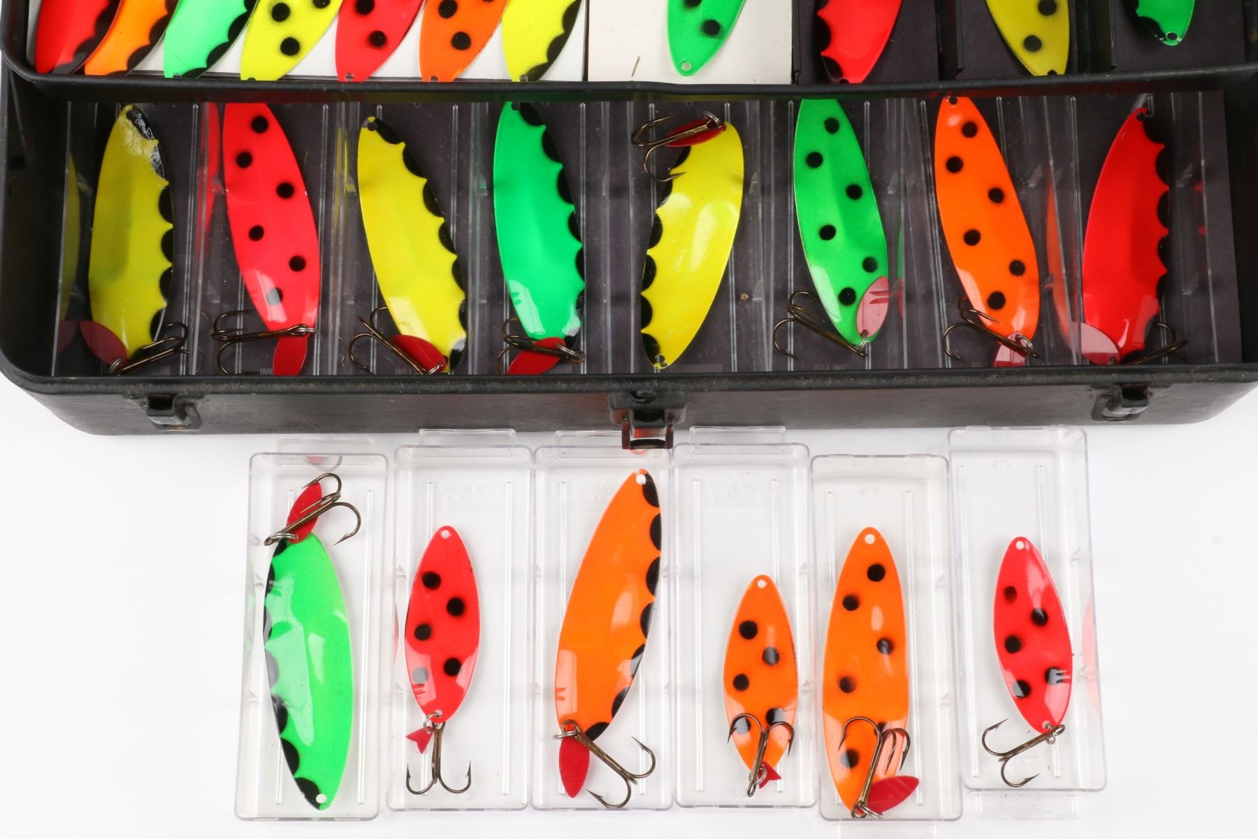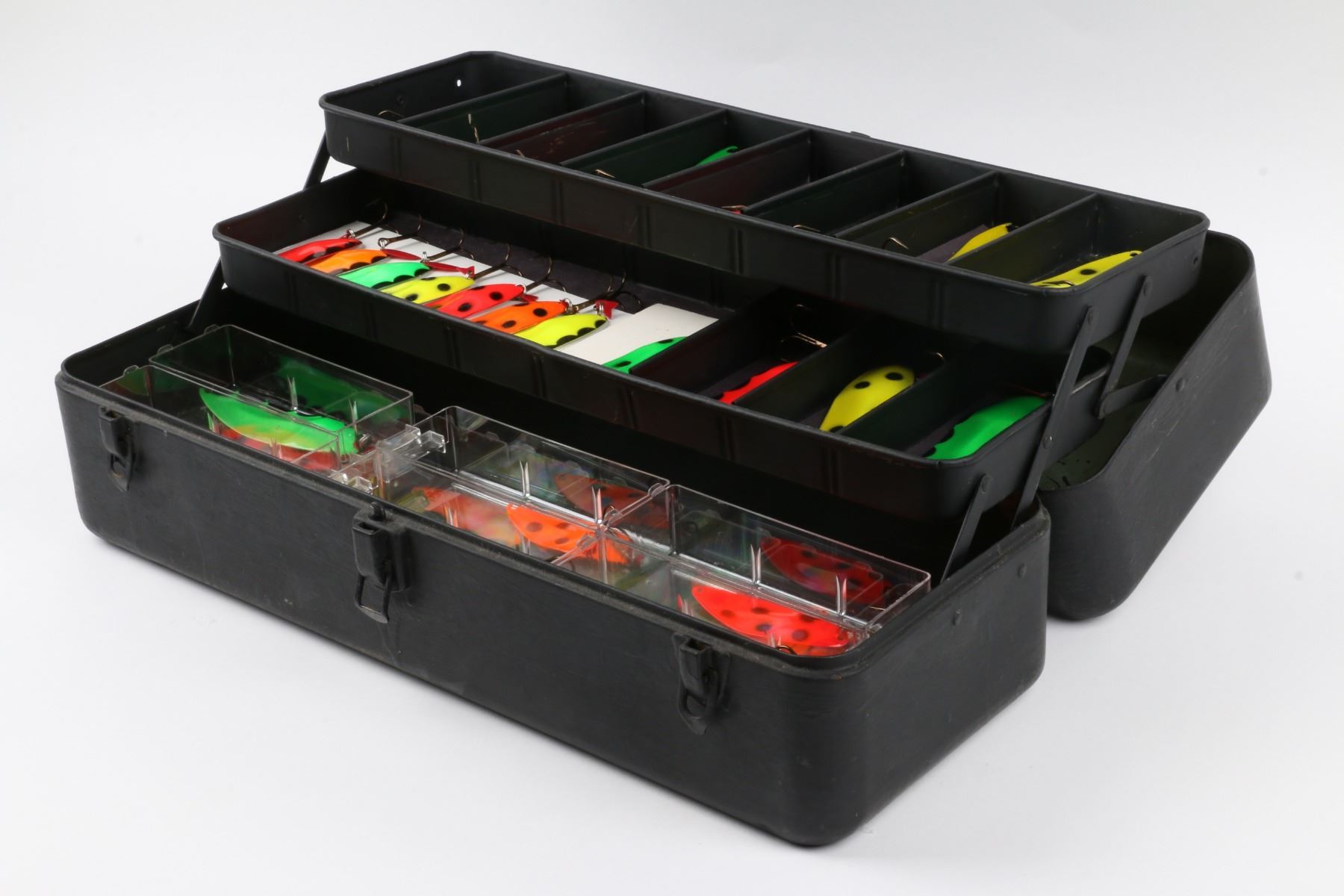 , Various Origins. Tackle Box. Material: Metal. Quantity: approx.. 32. Grade: VG. 19" x 7" x 7" Est. $50-75.