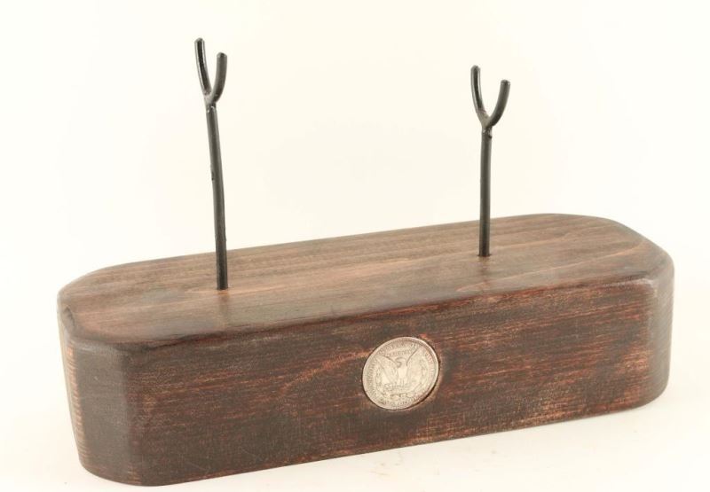Stained wood with rounded edges with a silver U.S. dollar coin mounted on the front. Measures 12"l x 5"w x 8"h. Great accent piece for the gun room. Made by a local AZ artist.