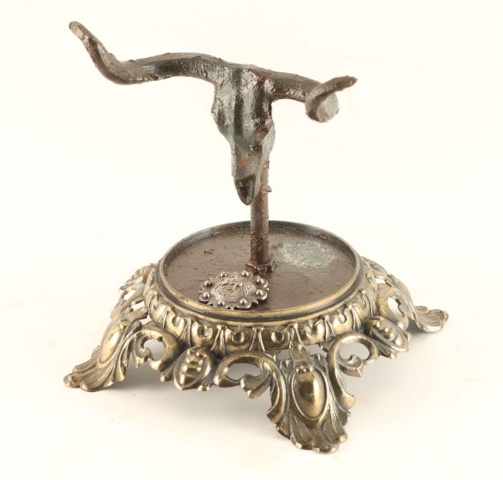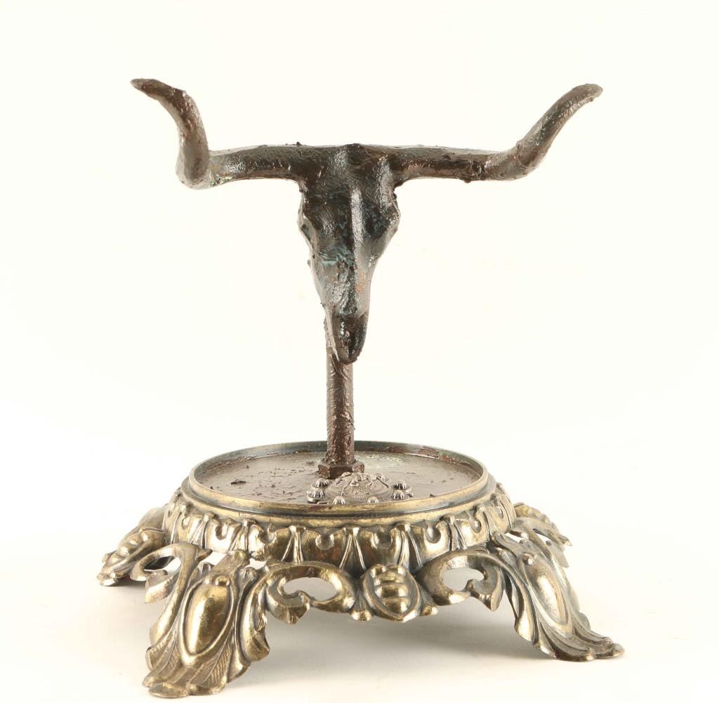 All metal construction with ornate swirled base and a longhorn steer skull to hold pistol. Measures 8 1/2" x 7 1/2"h x 8 1/2".