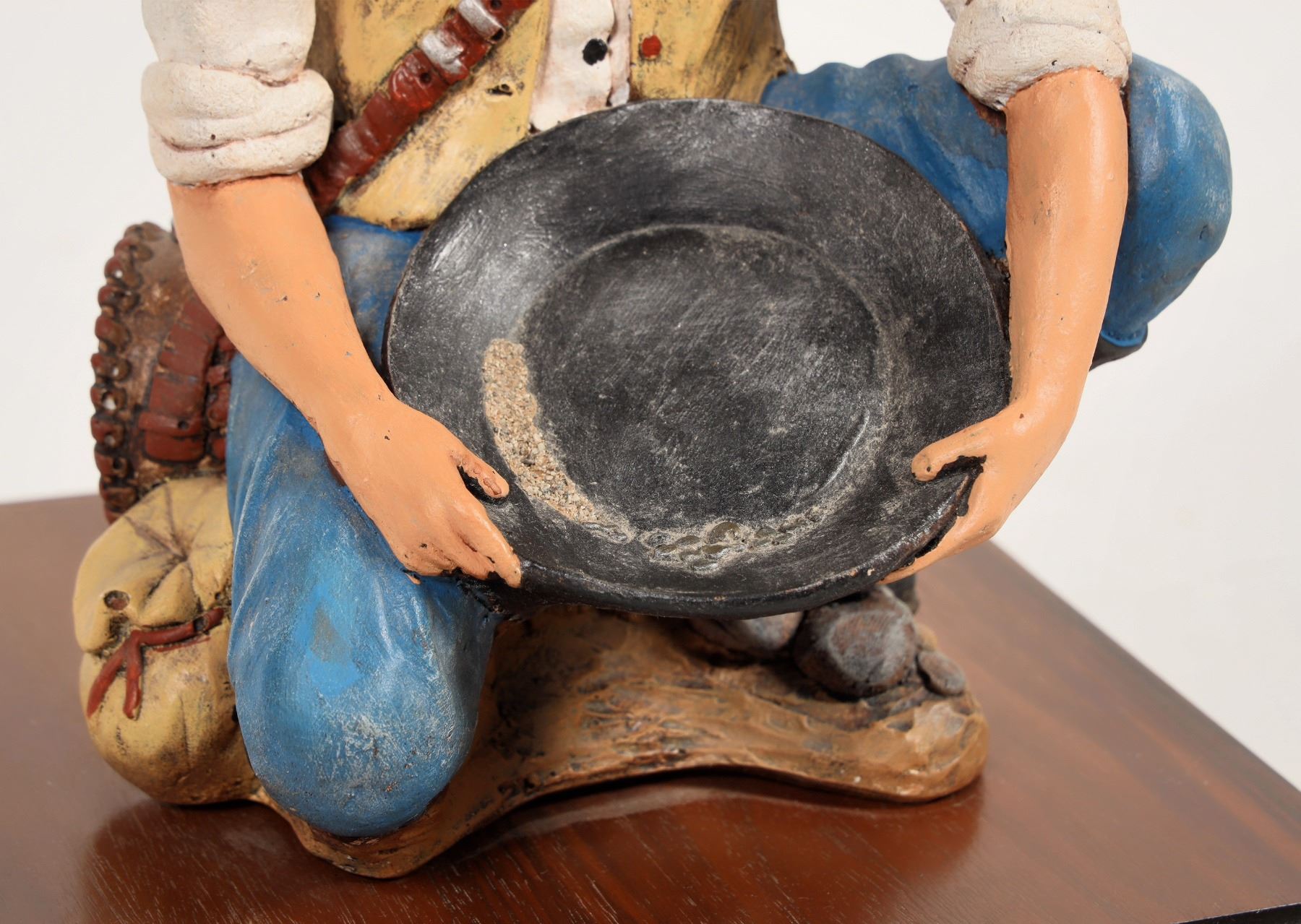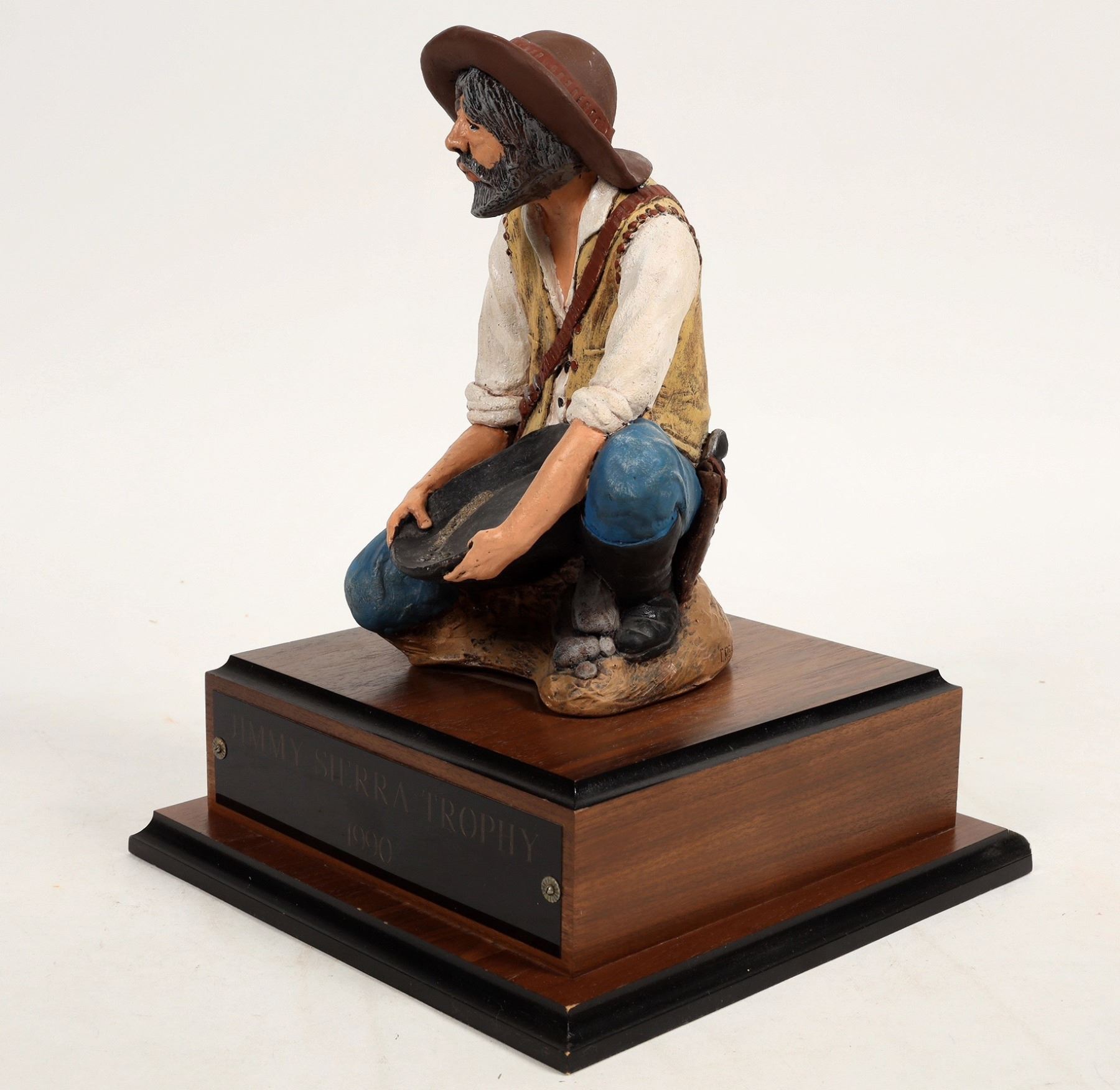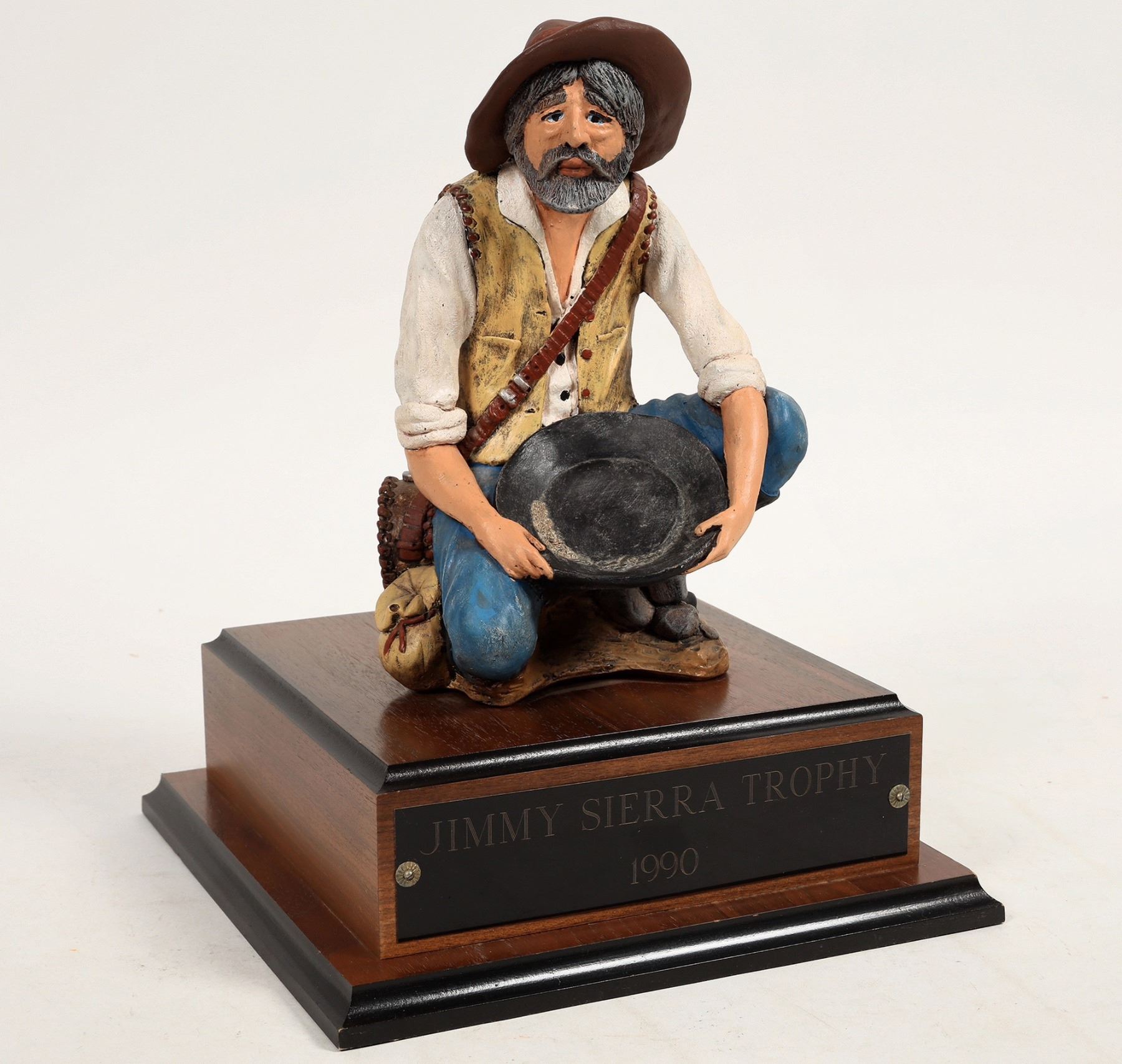 This is a custom-made "Jimmy Sierra Trophy" won by the "Nugget Ace" (who we've sold so many gold nuggets from in 2025). This was first place in a 100 person metal detecting contest. The Nugget Ace won using a Fisher Gold Bug. 14" H, 11 x 11" wood base. Prospector with gold pan, holstered gun, and water canteen. Back of statue says Creative Designs P.D. c 78. Unique!