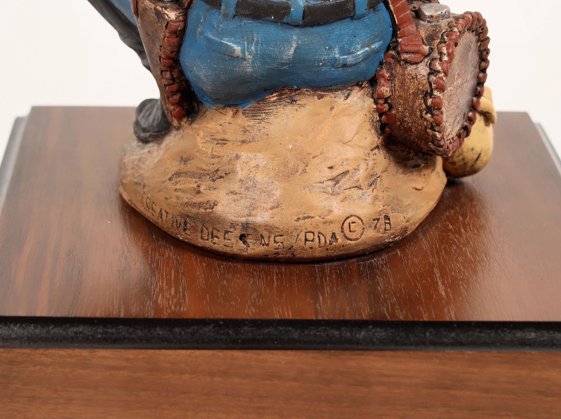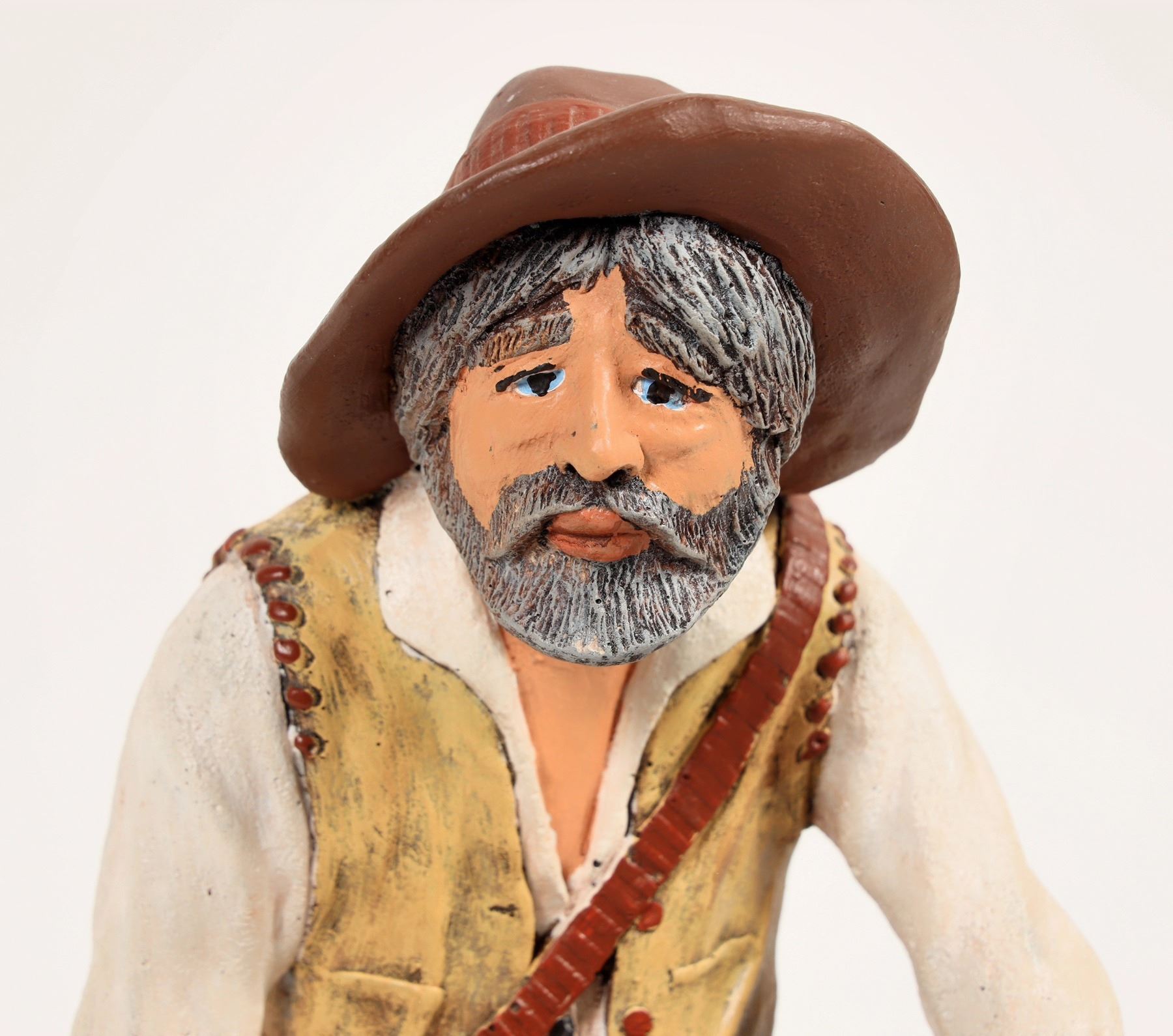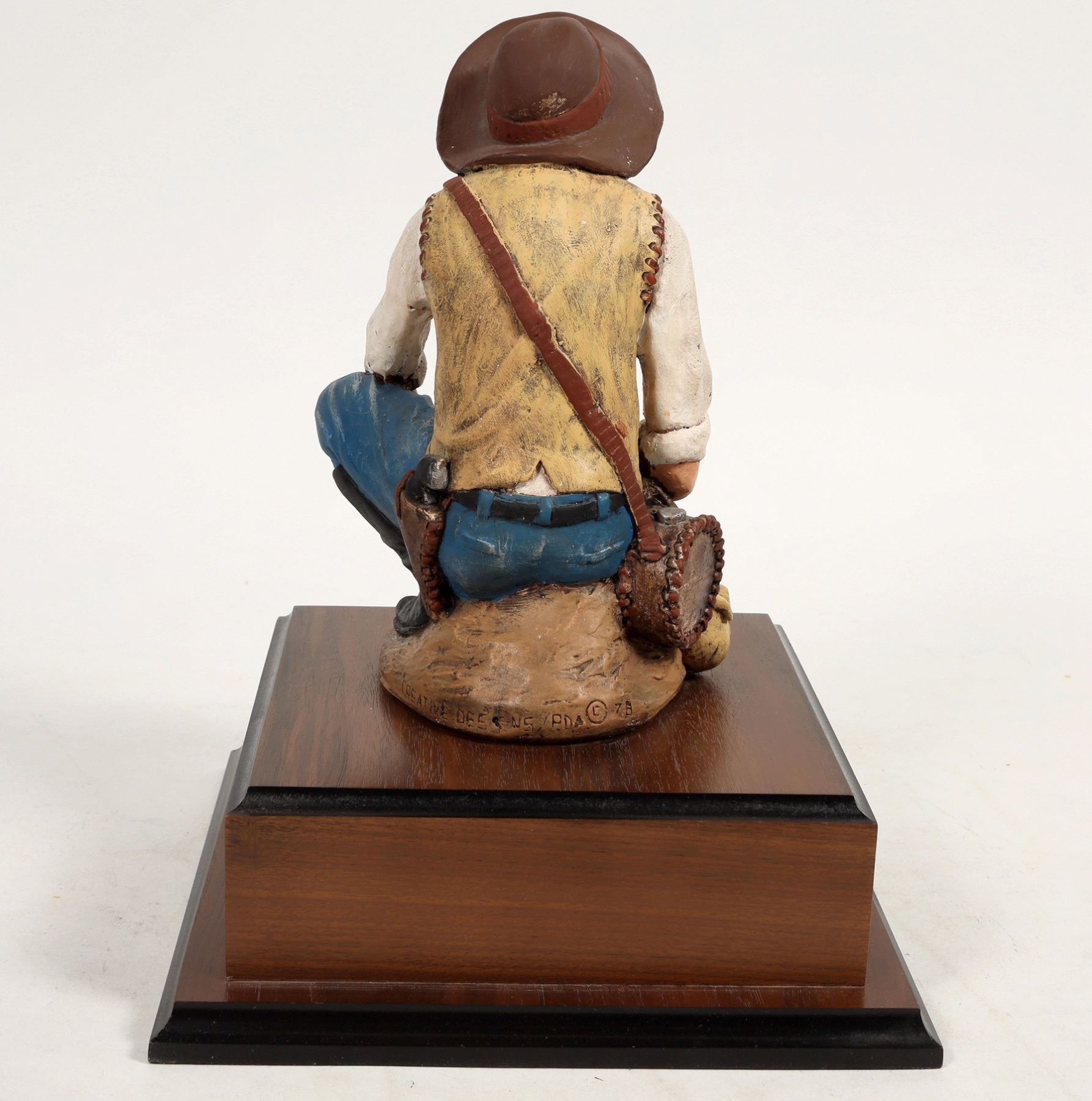 This is a custom-made "Jimmy Sierra Trophy" won by the "Nugget Ace" (who we've sold so many gold nuggets from in 2025). This was first place in a 100 person metal detecting contest. The Nugget Ace won using a Fisher Gold Bug. 14" H, 11 x 11" wood base. Prospector with gold pan, holstered gun, and water canteen. Back of statue says Creative Designs P.D. c 78. Unique!