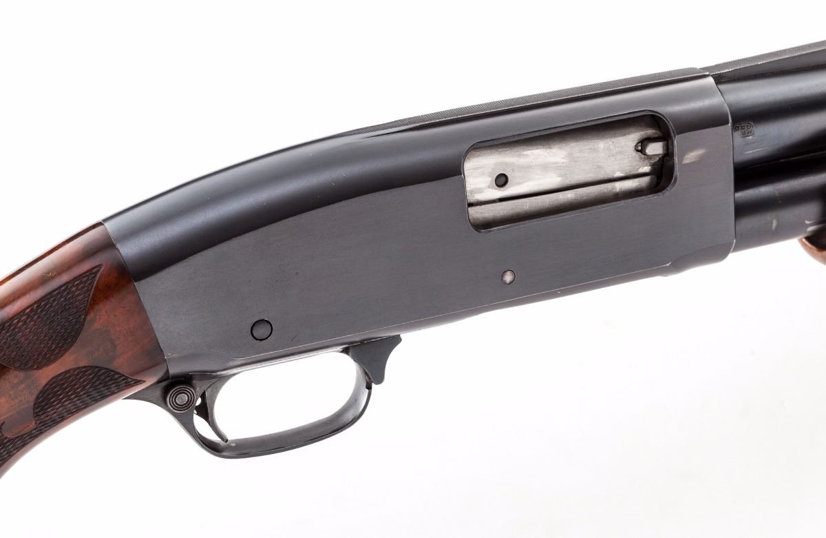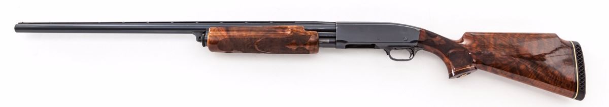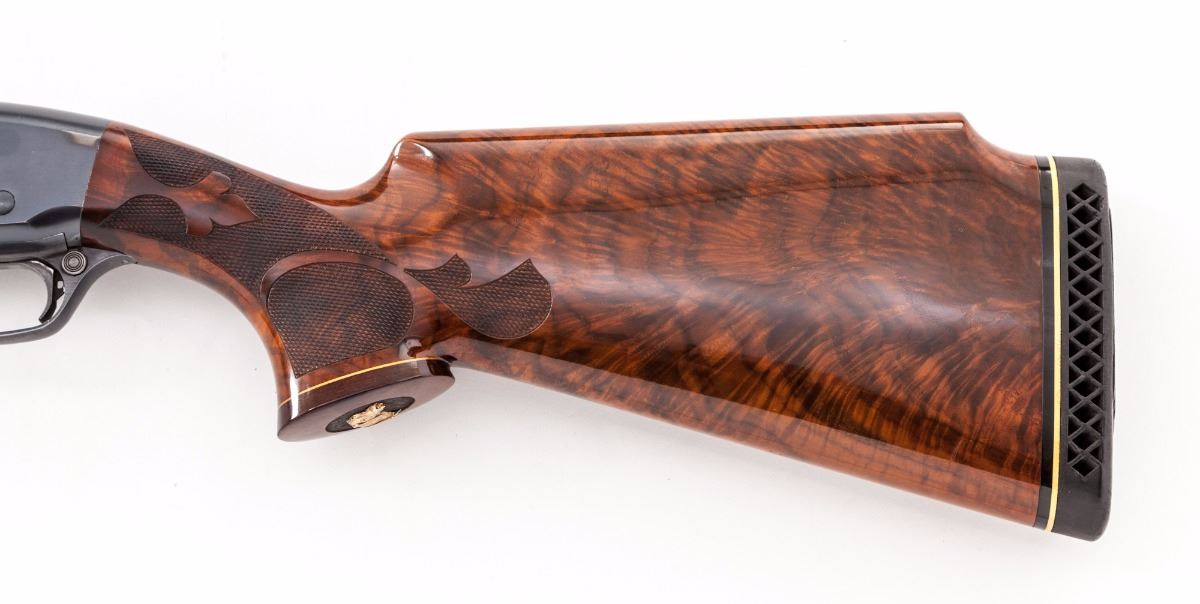Custom Stocked Remington Model 31-TC Slide Action Trap Shotgun, #65510, 12 ga., 2-3/4'' ch., satin blue finish, 30'' barrel with matted 5/16'' ventilated rib, Bradley type front white bead and middle steel bead, with a Full choke; receiver with triggerguard mounted push button safety; Monte Carlo stock and fingergroove target forend are Deluxe flame figure walnut with a striking grain pattern and a high-gloss finish with flared rosewood grip cap and an inset high-relief gold Labrador profile. Length of pull is 14-1/4'' over a 1'' black Pachmayr recoil pad, drop at comb is 1'', drop at MC is 1-1/8'' and drop at heel is 1-3/4''; weight is 9-1/8 lbs. Overall condition is very good as restocked. Bolt and firing pin have moderate wear; blue and wood finish are 98% with cycling and handling marks. Recoil pad is decomposing. Action is tight, bore is bright with light fouling. Est.: $800-$1,200. (C&R)
