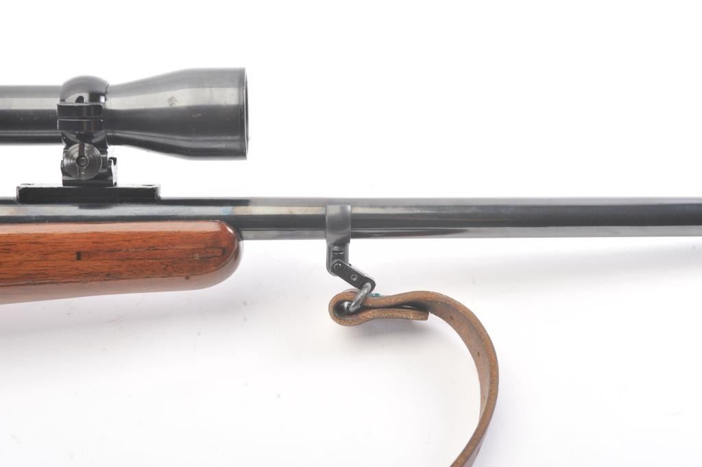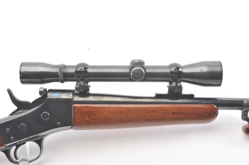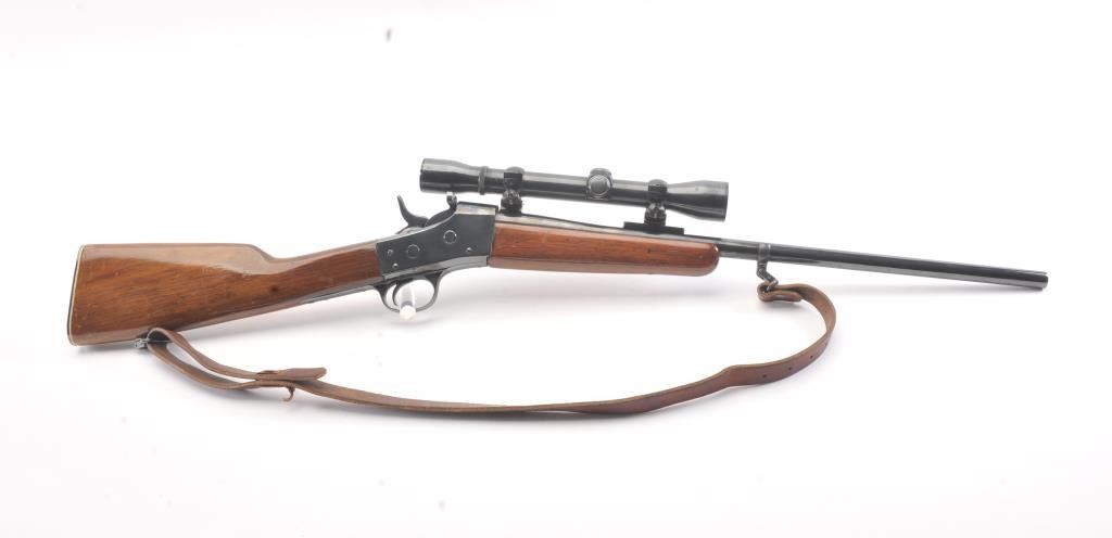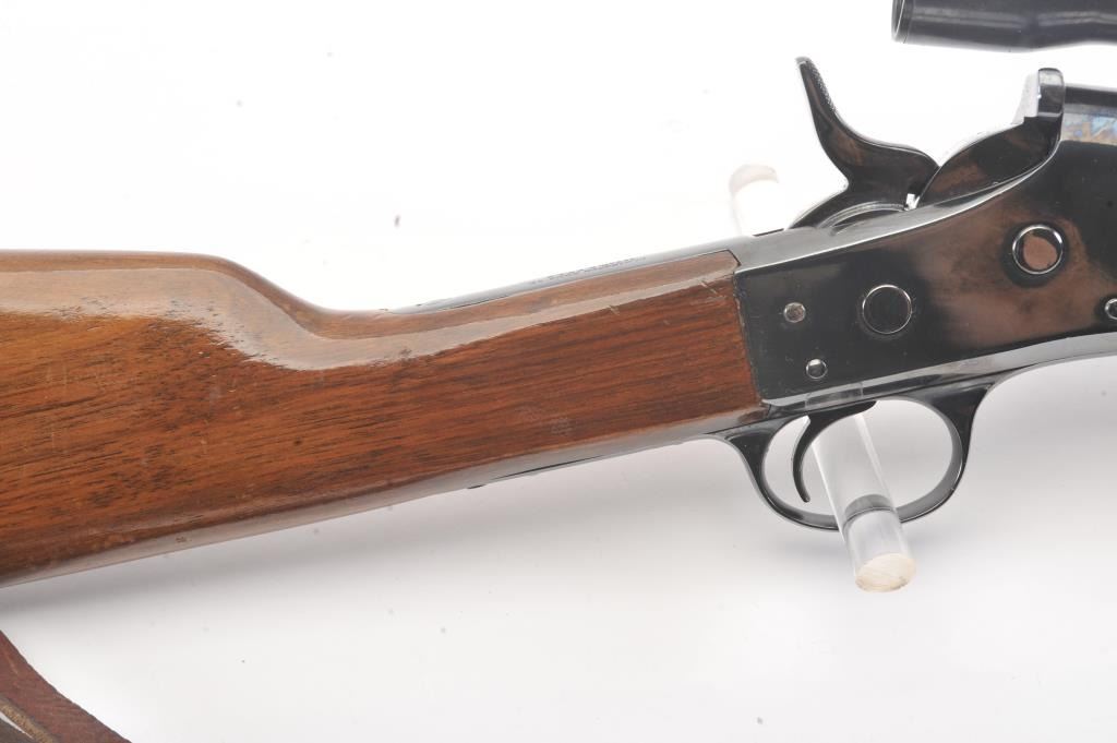 Custom Remington Rolling Block single shot rifle, 7mm Mauser caliber, Serial #NSNV. The rifle is in good overall condition as refinished. The barrel is 20 ½” in length with the sights removed and a barrel bandswivel installed. The rifle retains nearly all of the old re-blued finish. The smooth wood stock has been shortened to a 12” LOP and a coat of varnish added. The rifle is topped with a Weaver K4 fixed power scope.The bore is fair with areas of moderate pitting, the action functions and the markings are no longer visible. A period leather sling has been added. Est.: $250-$500. (C+R).