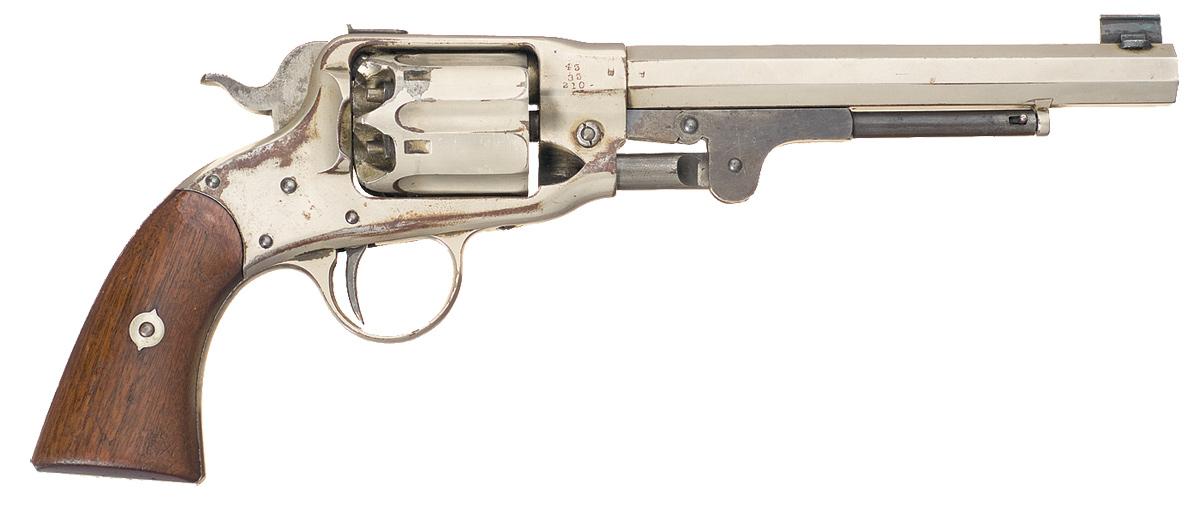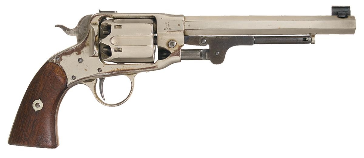 Period customized for target shooting, replated. The revolver retains approximately 80% frosted nickel finish with the grip straps having a smooth dark brown patina and some minor flaking. The rammer has a smooth dark patina. The grips are fine with some minor dings and scratches. Hammer is not solid in safety notch, otherwise mechanics are fine.